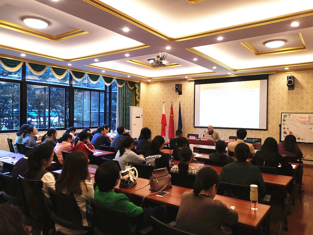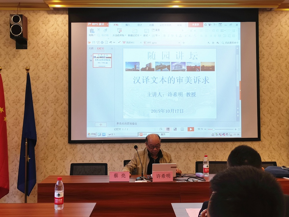 2019年10月17日下午,宁波大学外国语学院、国家社科基金和教育部人文社科基金匿名评审专家许希明教授受邀至浙江大学宁波理工学院外国语学院作主题为“汉译文本的审美诉求”的学术讲座,此次讲座也是外国语学院随园讲坛系列的第四十一期。本次讲座安排在浙江大学宁波理工学院外国语学院波兰研究中心SC106举行,讲座由外国语学院副院长蔡亮主持。