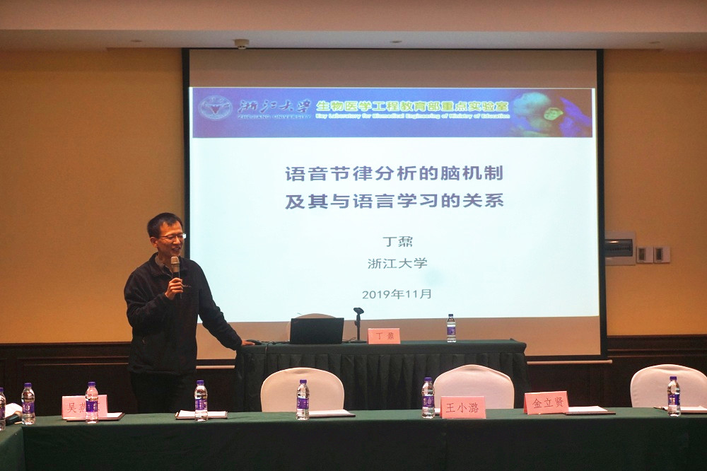 接着,浙江大学的丁鼐研究员作了题为“语音节律分析的脑机制及其与语言学习的关系”的专题发言。他指出层级结构的同步响应可以客观地反映二语水平,短期语言学习可以迅速激活大脑言语网络,功能磁共振为评估不同语言学习策略提供了获取客观依据的研究手段。