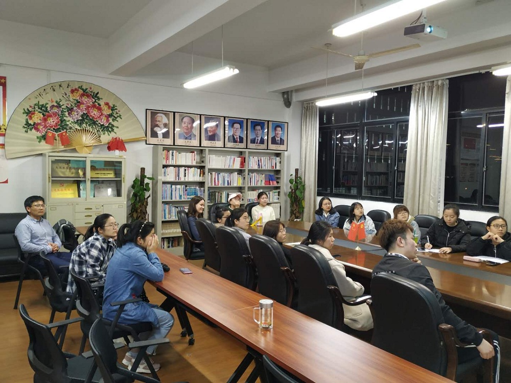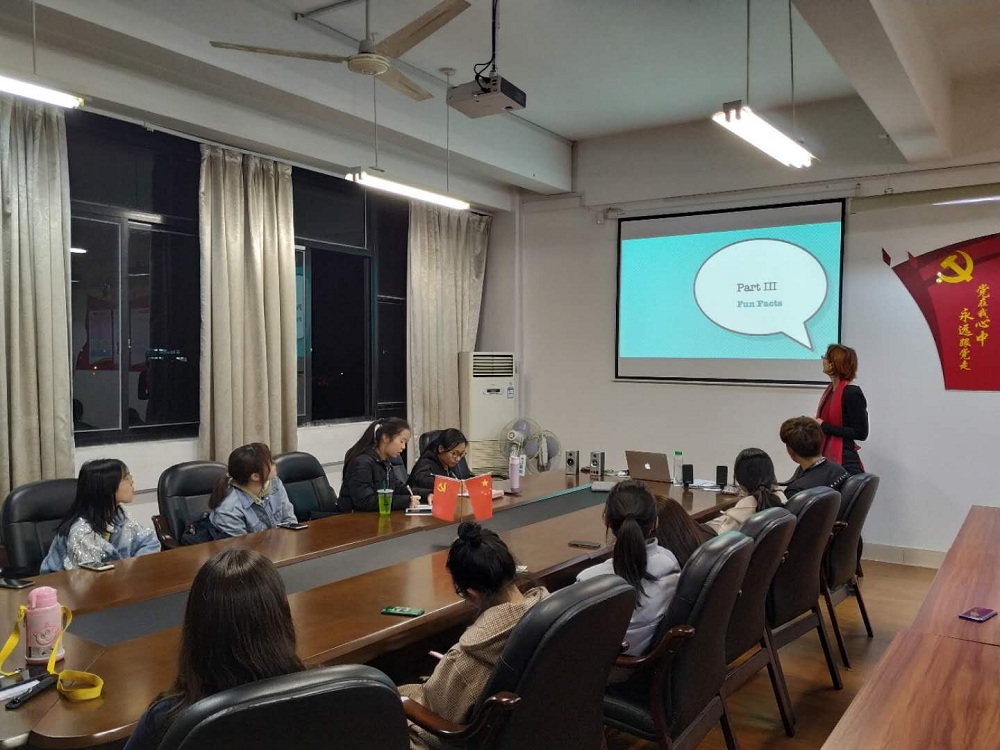 4月11日晚,由外国语学院外籍教师克里斯缇娜博士主讲的“语言真奇妙”系列工作坊第一场活动在SC408会议室举行,参加本次活动的有学校外事处程萌副处长、美籍外教林静和外国语学院近20余位同学。