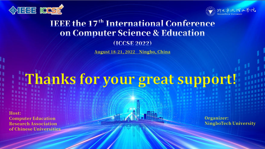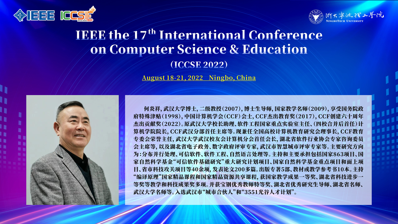 2022年8月18日-21日,第17届国际计算机科学与教育会议IEEEthe 17th International Conference on Computer Science & Education(简称IEEE ICCSE 2022)在宁波成功举办,来自中国、美国、澳大利亚、德国、意大利、泰国、印度和日本8个国家,183所高校的专家学者和师生嘉宾在线下主会场与线上腾讯会议共同参会进行学术交流。IEEE ICCSE 2022由全国高等学校计算机教育研究会(国家一级法人学会)主办,IEEE教育协会提供技术支持,浙大宁波理工学院外国语学院、教育部国别和区域研究备案中心—浙大宁波理工学院“波兰研究中心”、宁波市阳明文化创造性转化与传播基地承办。本届会议特别邀请了主办方全国高等学校计算机教育研究会理事长何炎祥教授,研究会原理事长王志英教授,研究会副理事长、IEEE ICCSE 2022荣誉主席李茂青教授;承办方浙大宁波理工学院党委书记、IEEE ICCSE 2022荣誉主席胡征宇,浙大宁波理工学院副校长鲁东明,以及主旨报告专家香港中文大学陈本美院士,清华大学胡事民教授和东南大学李世华教授。