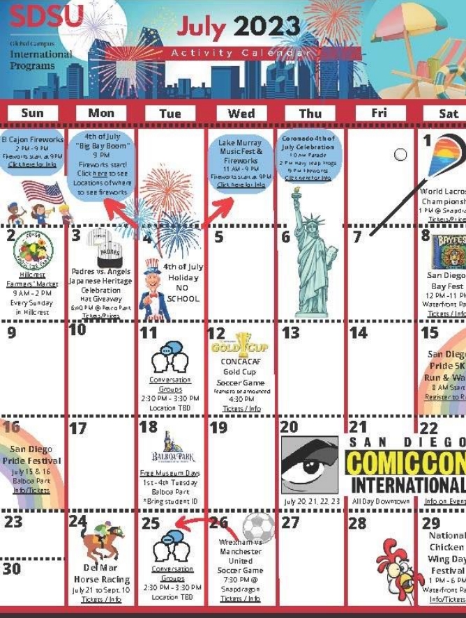 在SDSU学习的一个月时间里,学生有机会参加学校为国际学生精心安排的类型多样、丰富多彩的课外活动。2023年7月活动表参考如下,活动内容每月更新。