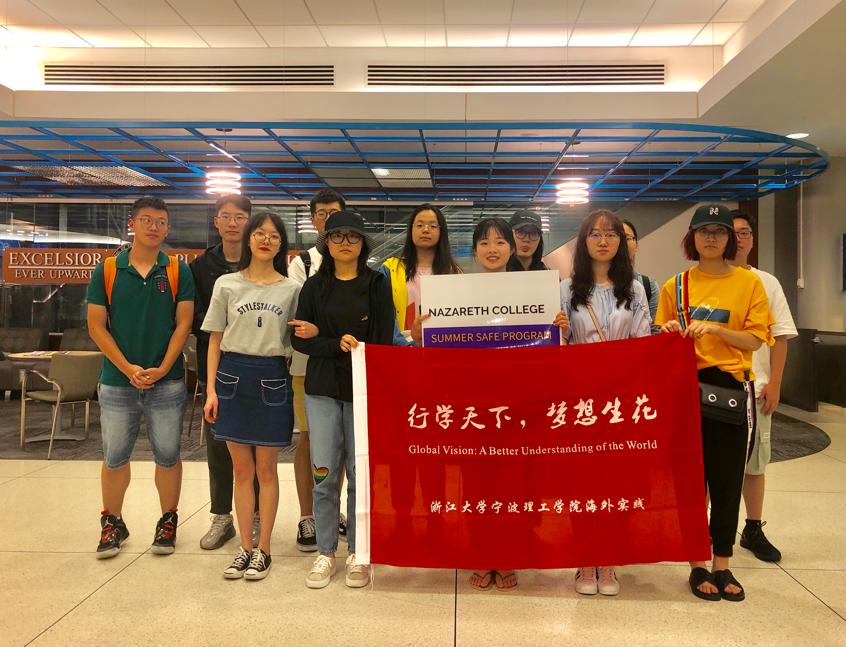 飞机飞上三万尺高空,经过23小时飞行加转机时间后,浙江大学宁波理工学院暑期海外游学美国团10位学生及带队老师周维于纽约时间2019年7月14日凌晨抵达位于纽约州罗切斯特市的拿撒勒大学。舟车劳顿,疲倦却被深夜仍在等候的学生助理的热情招待一扫而空。