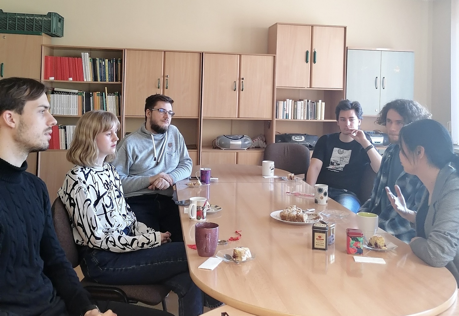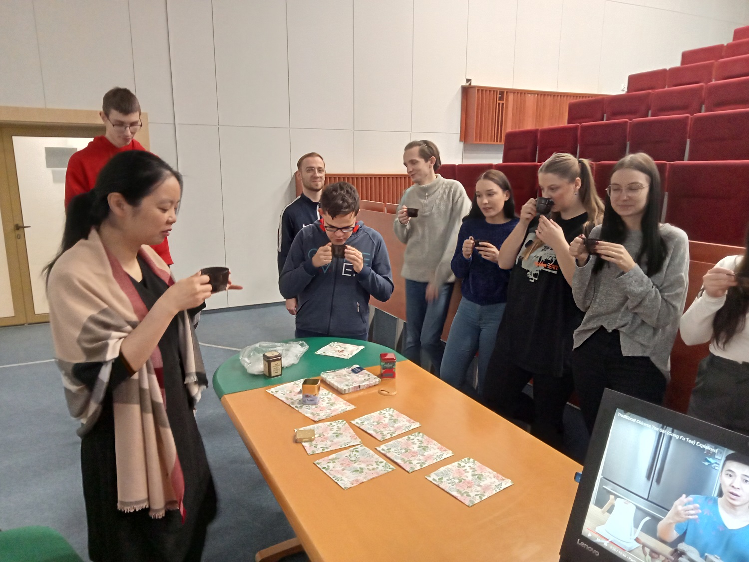 在文化讲座前,姚宇先介绍了我校波兰研究中心的建设历程,迅速拉近了与波兰师生的距离,她还展示了波兰研究中心和阳明学堂在近年来国际文化交流中取得的成果。精心布置、古色古香的阳明学堂引起了在场波兰师生对学习中国传统文化的兴趣。在讲座中,姚老师深入讲解了中国独具特色的春节习俗和茶文化。在工作坊和座谈期间,姚老师更是邀请他们一起品茶喝茶,在茶香浓郁中感受中华语言与文化的魅力。