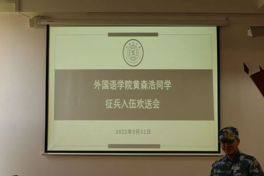 3月11日下午,浙大宁波理工学院外国语学院在SB408为英语214班黄森浩同学举行征兵入伍欢送会。学院党委副书记任凯、思政主管芦美丽、副主管阮佳蒂、辅导员张弦、英语214班班导师查德华协同班级同学,以及十余名学生党员共同参加本次欢送会。