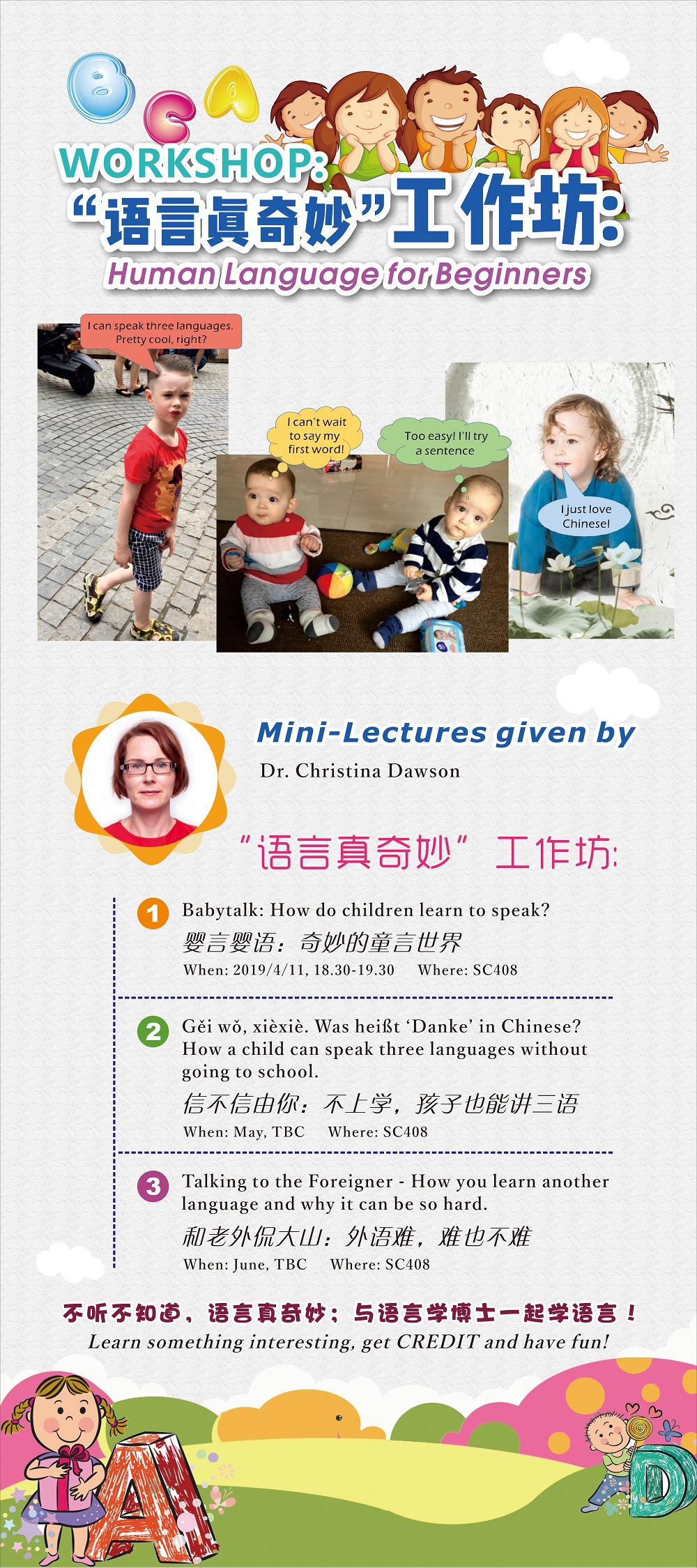我校外籍教师Christina博士将在本学期举办举办“语言真奇妙”工作坊活动,主要面向对英语语言学研究和学习有兴趣的同学,具体举办时间和地点如下,欢迎有兴趣的师生前来参加。