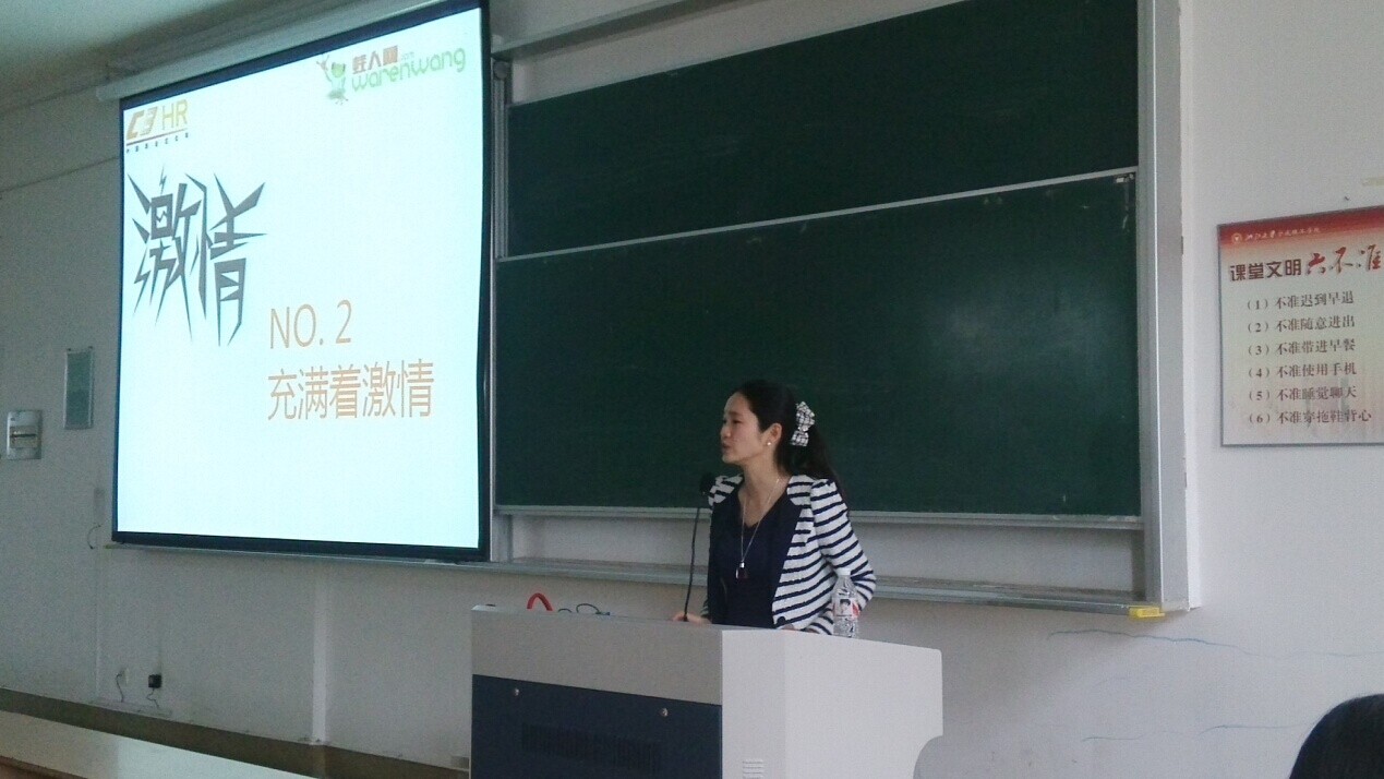 4月27日,外国语学院邀请鄞州蛙人网总经理周洁莹为12级学生作了就业指导专题讲座。讲座主要分为两个主题,一是“发展优势,成就自我”,二是“如何找到适合自己的工作岗位”。