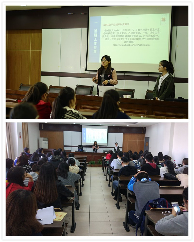 会上,辅导员芦老师以竺可桢老校长的两个问题引申开来,从做人、做事、学习、生活四个方面给2016级学生干部提了很多实用的建议,希望同学们树立远大目标,在工作中积极思考,学会发展,学会做人,学会做事,学会学习,争做理想远大、信念坚定;品德高尚、意志顽强;视野开阔、知识丰富;开拓进取、艰苦创业的新时代优秀青年。