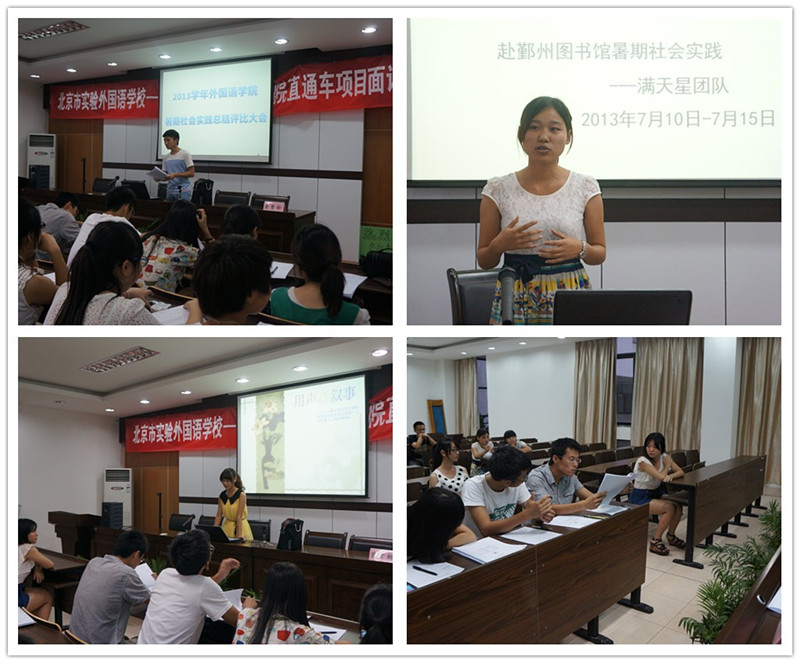 9月22日下午4时,外国语学院2013年暑期社会实践总结评比大会在SC405准时举行。外国语学院团委书记刘杰老师、校团委实践部周祥同学、学院团委宣传部唐晓琳同学、实践部赵雅婷同学担任本次评比大会的评委。各实践团队队长、宣传员和安全员参与了本次会议。会议由外国语学院团委副书记王宽主持。