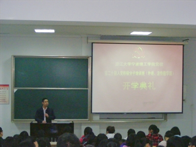 开学典礼在庄严的国歌声中开始,首先梁昌海老师宣读了教学班教学计划,根据本期入党积极分子培训班的具体情况,本期教学班教学计划分为课堂授课、电教、讨论以及社会实践和网上党校学习等环节,共计40课时,内容丰富,教学形式多样。教学班班主任陈印昌宣读了教学班管理规定。随后,外语分院的斯文俊和法传分院的史佳两位同学作为学员代表做了发言。发言中两位同学从对党的认识谈起对党的感情和向往,从党的历史和现时代党的任务谈起努力向组织靠拢的决心,从当代青年的特点和历史责任谈起对自身修养提升的意义。他们还从学院发展和人才培养质量工程等问题出发,结合自身实际和文明修身工程的要求谈了学生尤其是学生党员的努力方向。