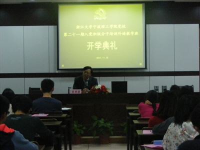 会议伊始,胡老师宣布浙江大学宁波理工党校第二十一期入党积极分子培训班外语学院教学班开班典礼正式开始。在国歌声中,同学们个个挺直了脊梁,唱响国歌。接着,方老师宣读《党校授课计划》和《党校教学管理暂行规定》,让在座学员明确了培训班教学日常、党校纪律、考勤抽查制度以及请假制度。随后,教学班班主任李炜老师为学员们作动员讲话。他向新学员表达了真诚的欢迎与祝贺,并对党校做了正确的定位解释。他希望全体学员珍惜本次党校培训的机会,以党员的身份严格要求自己,在学习工作中争做先锋模范,努力为学院建设做出贡献。党校学员代表英语114班张璧联珠同学发言,她表达了珍惜培训机会,加强学习,培养实干精神,努力成为高素质的“应用型、复合型、外向型”创新人才的决心。仪式在雄壮的《国际歌》中落下帷幕。