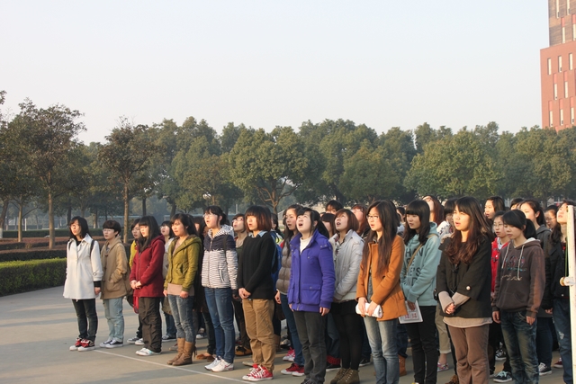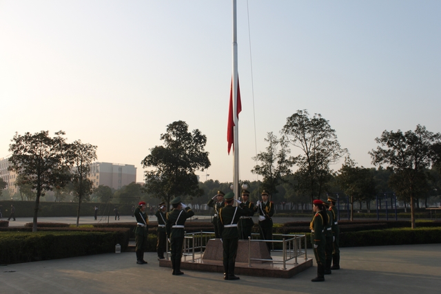 在初升的太阳下,学校国旗护卫队迈着铿锵有力的步伐走向升旗台,庄严有序的做好升旗前的准备工作。鲜艳的五星红旗在雄伟的国歌声中冉冉升起,全体大一同学一齐向国旗行注目礼,并高唱国歌。