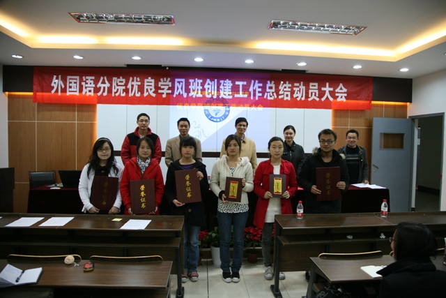 优良学风人人共创,学风优良人人共享,外国语分院将一如既往的坚持重点突出,措施有力,注重实效的创建原则积极推动分院整体优良学风的形成。会上还对2009-2010学年获得优良学风示范班、优良学风班、优良学风创建班及各单项荣誉的班级进行表彰。