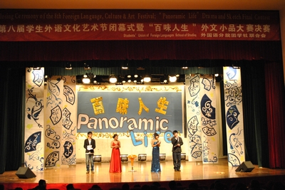 随后第八届外语文化艺术节的重要子活动——百味人生外文小品大赛拉开帷幕,参加当晚决赛的八支队伍是从报名参赛的21支队伍中选拔而来,各个节目主题鲜明、内容丰富、形式多样,难能可贵的是很多节目都是同学们自己编剧排演,比如中美091班的《三打白骨精》取材于人尽皆知的《西游记》,又融合现代元素;086班的《祝福》则改编自鲁迅作品;082班的《非诚勿扰》别出心裁的将电视节目搬上舞台。各支队伍不仅在舞美设计上匠心独运,也在服装、灯光上花了不少心思。所有节目坚持突出外语特色,演员们声情并茂地演绎博得在场观众的热烈掌声。
