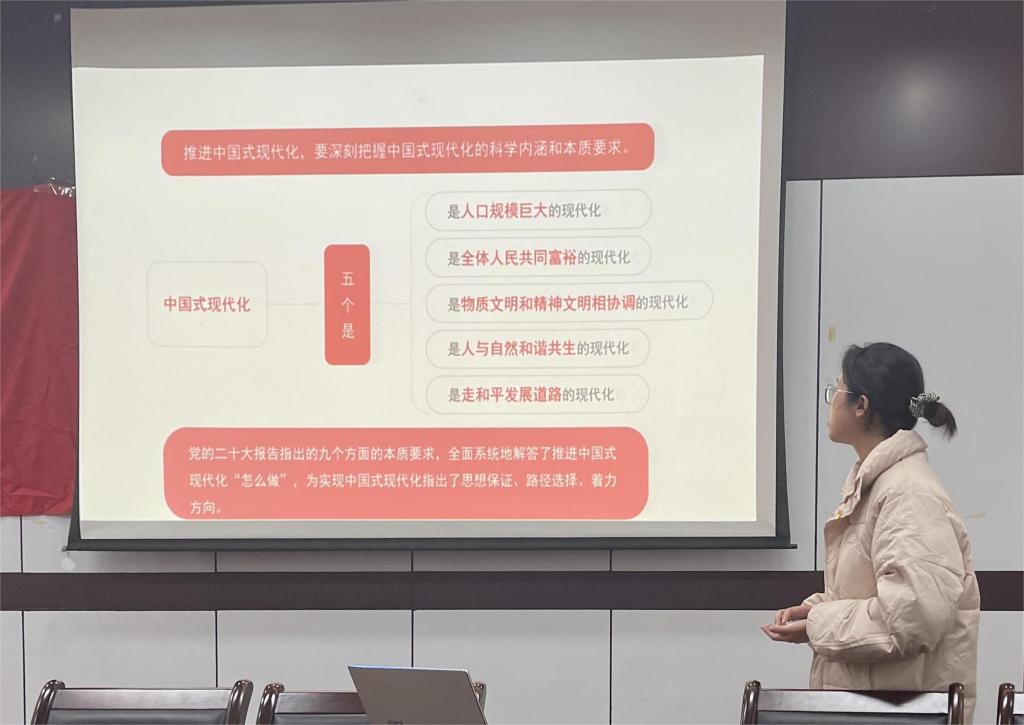 宣誓结束后,“随园问辨”第32期学习党的二十大精神主题党日活动正式开始,6名学生党员对二十大精神进行了领学。英语202班蔡紫颖结合二十大报告中提到的“中国式现代化”这一关键词进行了讲解,并号召学生党员心怀远大理想、努力提高自身素养,以实际行动为全面建设社会主义现代化国家贡献青年力量。日语191班王昊提出学生党员应从“加强理论学习,落实知行合一;时刻团结,紧密联系群众;强化责任担当,展现优良作风”三个方面来践行二十大精神。日语201班王蒙妃结合自己参加挑战杯活动的实践感悟,对共同富裕等关键词进行了解读。除了理论学习,学生党员还以文艺微党课的形式表达自己对二十大精神的理解,如学生英语201班陈佳鑫就二十大报告的经典内容进行了诵读,英语204班姚可欣、英语203班郑恬雅分别以“我心向党,诗颂中华”、“奋斗新征程”为主题带来了深情饱满的二十大精神诗歌朗诵。