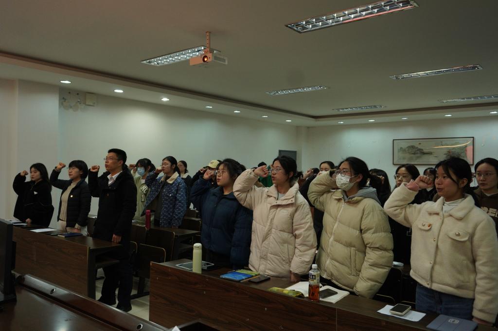 我志愿加入中国共产党,拥护党的纲领……”3月27日晚,外国语学院学生党支部学习党的二十大精神主题党日活动暨新党员入党宣誓仪式在SC405举行,25名新党员和在场的正式党员面向鲜红的党旗举起右拳,在学校“党员之星”获得者、学生第一党支部曹颖的带领下庄严宣誓。学院党委副书记任凯、党委组织委员芦美丽老师参加了活动。