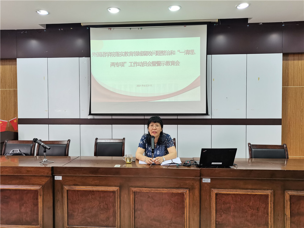 6月21日下午,外国语学院在SC405会议室召开落实教育领域腐败问题整治和“一清理、两专项”工作宣传教育和警示教育会。学院全体教师参加了此次会议,会议由学院党委副书记(主持工作)傅晓宇主持。
