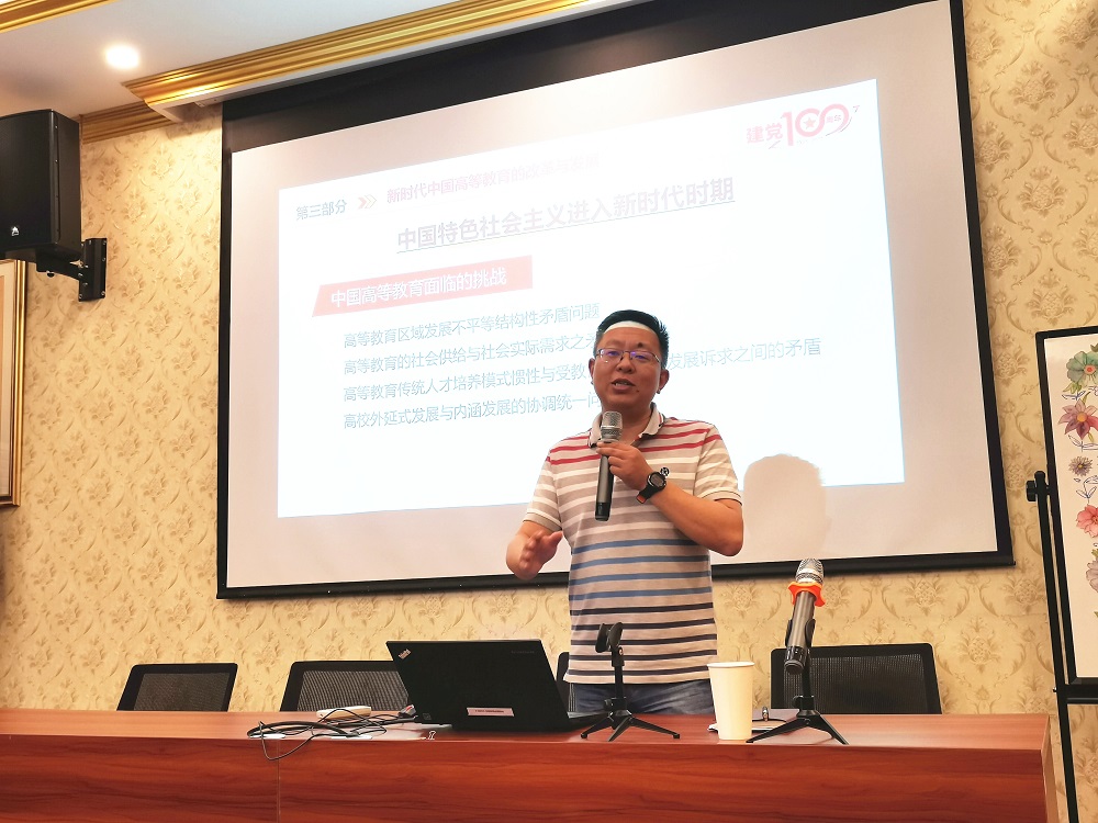 本次党课主题围绕中国共产党领导的高等教育展开。俞老师将本次主题分成三个模块,分别是中国共产党领导高等教育的历史轨迹、中国共产党领导的高等教育优势和新时代中国共产党领导的高等教育改革和发展。通过讲解,同学们对我国高等教育的发展历程有了一个立体的认识。最后俞老师还鼓励大家在学好自身专业知识的基础上,加强对个人核心竞争能力的培养,包括综合素质能力和团队合作能力。党课结束后,俞老师对学生党员的提问做了耐心、细心的解答。