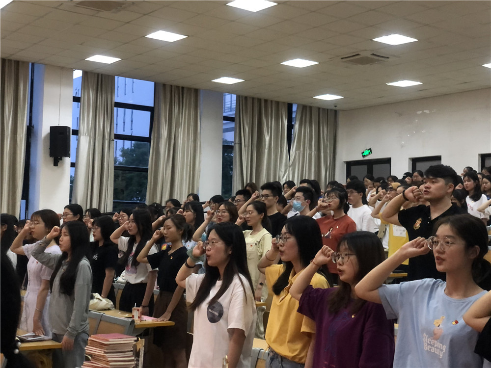 在学校2020年度党员之星、英语172班陈鑫瑜同学的领誓下,5月新发展的学生党员进行了入党宣誓,老党员们重温了入党誓词,宣誓仪式后,老党员为新党员佩戴了党徽。