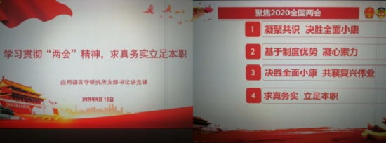 为深入学习领会“两会”精神,更好立足本职工作,6月18日中午,外国语学院应用语言研究所教工党支部在钉钉直播上进行主题为“学习贯彻‘两会’精神,求真务实立足本职”的党课学习。除了一名不在国内因时差关系计划收看回播的教师外,该支部其他党员教师均准时在线参加。党课主讲人为支部书记周先武老师,活动由支部宣传委员邓丽静老师主持,
