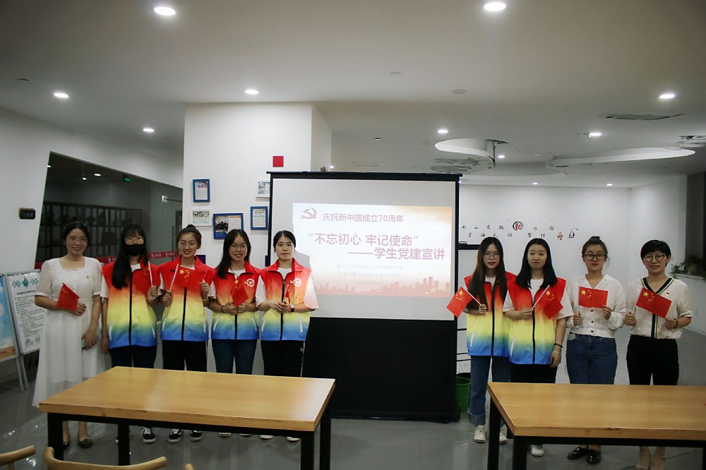 今年是中国共产党风雨征程的第98年,纪念五四运动100周年,建国70周年。70年的风雨征程,无数的先烈用鲜血染红了中华人民共和国的旗帜,不忘初心,牢记使命,是党始终铭记历史的重要力量。外国语学院学生在深入学习党的革命历史和革命精神的基础上,9月25日晚,学生第一、第二党支部以 “不忘初心、牢记使命”为主题,在支部书记芦美丽、刘杜娟两位老师的带领下,走进宁波鄞州首南街道文华社区开展主题宣讲。文华社区党建负责人严静和20余名党员同志参加了本次活动。