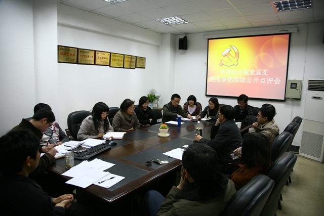 根据学院党委对创先争优活动的统一安排,外国语分院党总支于2010年12月10日召开支部书记公开承诺点评会,会上党总支书记谌晓煜对各支部书记进行点评。会议由谌晓煜书记主持,全体教工和学生支部负责人到会。部分党外人士代表也应邀出席了会议并对总支的创先争优活动提出了建议。