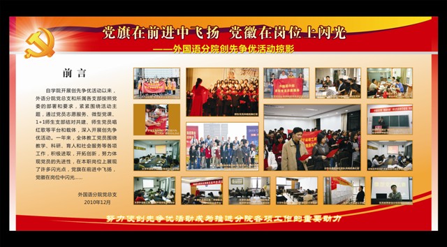 自学院开展创先争优活动以来,外语分院党总支和所属各支部按照党委的部署和要求,紧紧围绕活动主题,通过党员志愿服务、微型党课、1+1师生支部结对共建、师生党员唱红歌等平台和载体,深入开展创先争优活动。一年来,全体教工党员围绕教学、科研、育人和社会服务等各项工作,积极进取,开拓创新,努力体现党员的先进性,在本职岗位上展现了许多闪光点。为展示分院教师党员风采,表彰先进集体和个人,外国语分院党总支举办了“党旗在前进中飞扬,党徽在岗位上闪光”--2010年外国语分院教师党员风采展。