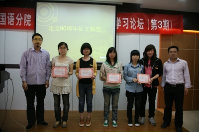 “有中国共产党在,不怕没盐吃!”随着一句句诙谐幽默又发人深省的演讲词,一次形式新颖的微型党课进入高潮。 这就是4月28日下午在SC405开展的外国语分院第三届“随园问辨”学生党员微型党课暨建党90周年征文颁奖典礼。本次“随园问辨”以“我和党的故事”为主题,各位学生党员以自叙的方式讲解“我和党的故事”。外语分院党总支书记谌晓煜、分院思政主管方芳、分院思政副主管李炜和团委副书记陈印昌等老师也参加了活动。 活动伊始是“分院建党九十周年征文”颁奖仪式。谌晓煜老师认为通过征文表现出广大同学的创造力,体现了现在党员对中国共产党的热爱和支持。 随后微型党课正式拉开帷幕。胡慧中、李欢欢、徐航远等6位预备党员代表从不同的角度切入话题,进行了精彩的演讲。党员们分别从党的历史、党史上的今天、当前国际形势下的党、我心中的党和抢盐问题中的党等方面做了精彩而全面的论述,并针对话题或问题提出了自己的见解和思考。 这次特别的微型党课教育,为党员们提供了一个学习时事党政的平台和交流感受的机会,所有到场党员提高了党性修养和政治理论水平,并表示希望在以后的生活中起更积极的带头作用,严格要求自己,在面对问题时勤于思考,争做一名思想合格、行动奉献的党员。