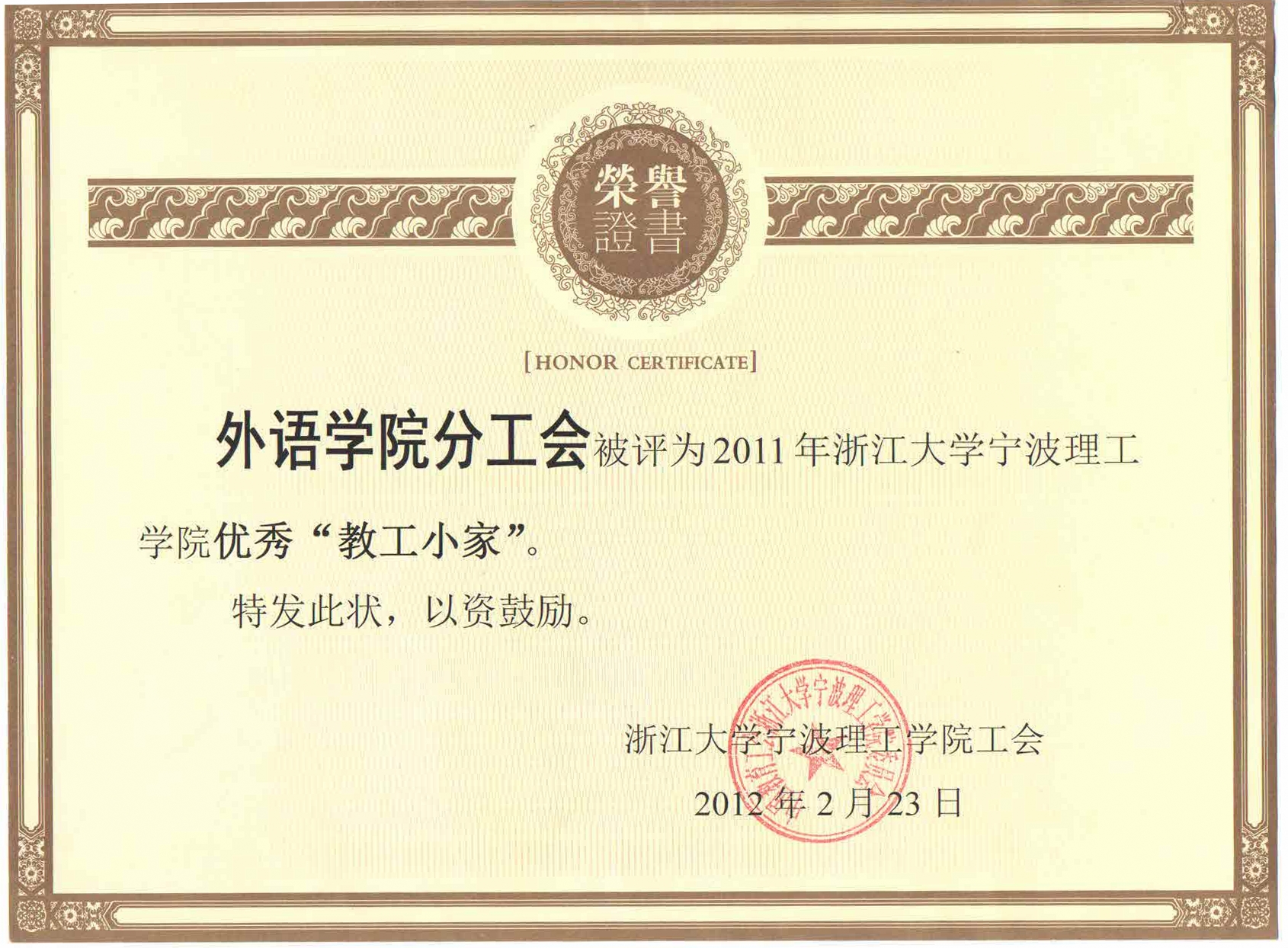 近日,经过各分工会代表对本单位一年来开展“教工小家“创建活动情况的汇报、交流和无记名投票评选,外语分工会被评为学校2011年优秀“教工小家”。这是继外国语学院在2008、2009年度荣获“优秀教工小家”之后第三次荣获该项殊荣。
