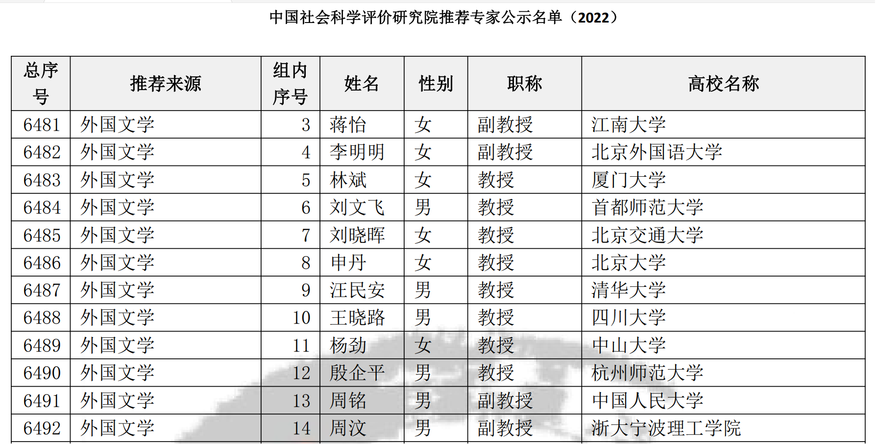 早在今年5月,中国社会科学评价研究院就开始了A刊评价专家委员会和同行评议推荐专家的推荐、资格审查核实及审议工作,并分别于5月初和7月底对专家委成员和同行评议推荐专家名单进行了公示。外国语学院周汶老师由于在外国文学研究领域取得的不俗成绩而受到相关期刊的推荐,并被中国社会科学评价研究院确认为本次A刊评价同行评议的推荐专家。据悉,这是今年我校唯一一位入选的A刊评价推荐专家。