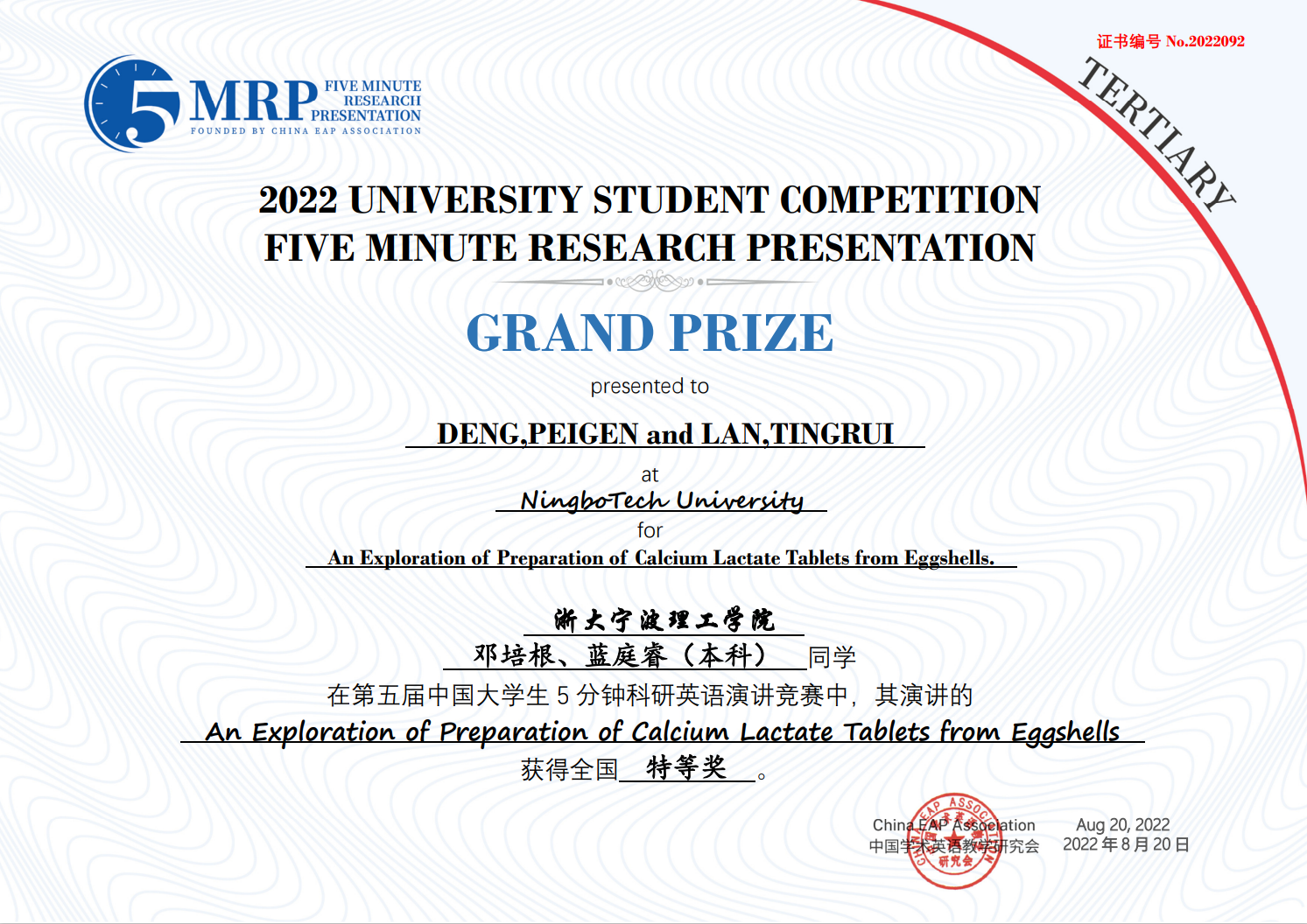 对于参赛获奖,邓培根同学直言收获颇丰:“这次参赛除了锻炼了我们的学术英语演讲能力,还锻炼了与组员、老师之间的沟通能力、自己去发现问题并解决问题等能力。比赛内容选题与我曾经参加的科研项目有关,该项目由周先波老师带领,感谢她当初一步一步带着我们完成项目。本次参加科研英语演讲能获得好成绩,离不开外语学院王欢老师的鼓励、督促和指导,还有王丽芳老师提供的各种帮助。也感谢我的搭档蓝庭睿同学和我一起对演讲内容和技巧反复打磨。备赛过程中,我还接触到了我们学校很多优秀的、有能力的同学。我想说,这类比赛能很好地提升我们的综合能力,从专业研究能力到学术英语语言能力,从舞台表现力到心理素质。希望今后能有更多的同学踊跃报名此类比赛,这不仅是一个为校争光的机会,还是一个磨练自己、使自己成长的契机。”