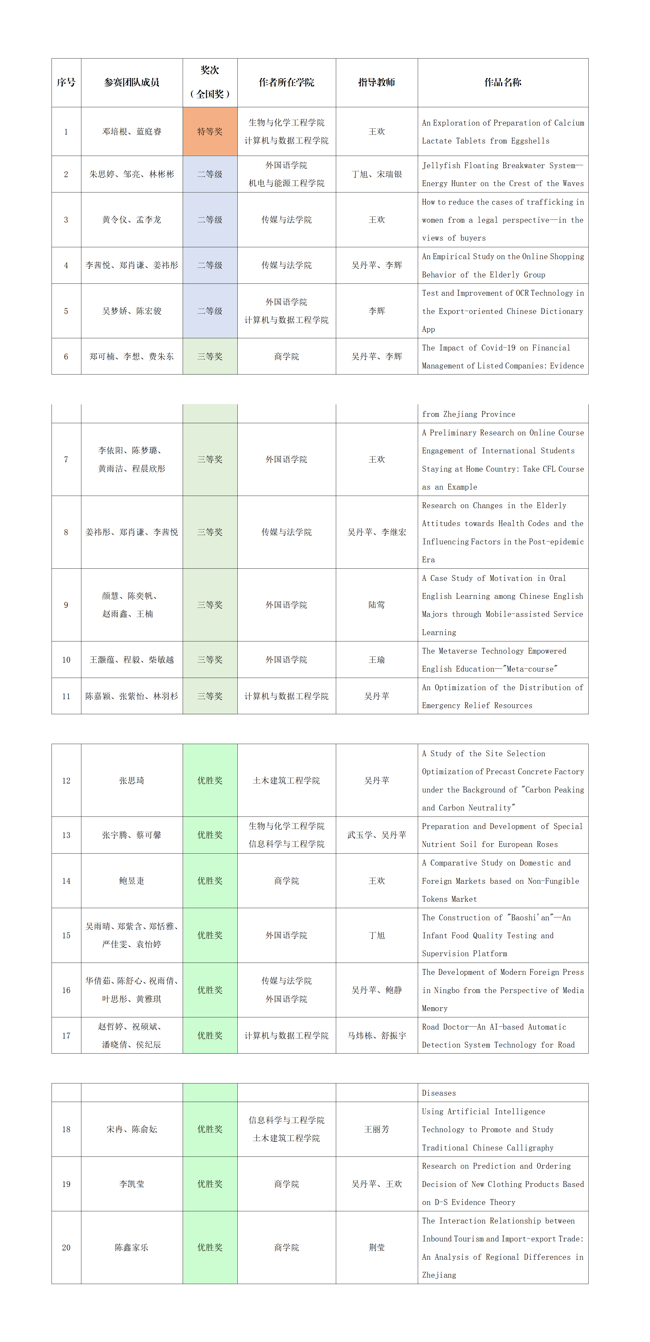 自今年四月启动以来,本赛区共收到作品共33组,其中本校29组,分别来自外国语学院、商学院、传法学院、土建学院、生化学院、计算机与数据学院,以及跨学院合作。为了确保比赛的公平公正,参赛作品按专业相似性分为四组,每组都邀请2位评委分别进行独立匿名评审进入赛区复赛。复赛现场评审专家也呈现多元化,有来自外国语学院、启新学院、学工部、商学院、传法学院、土建学院共六个学院(部门)的八位老师。复赛后全部参赛作品提交到平台,由全国评审专家匿名复核,最终确定了本赛区的获奖名单如下: