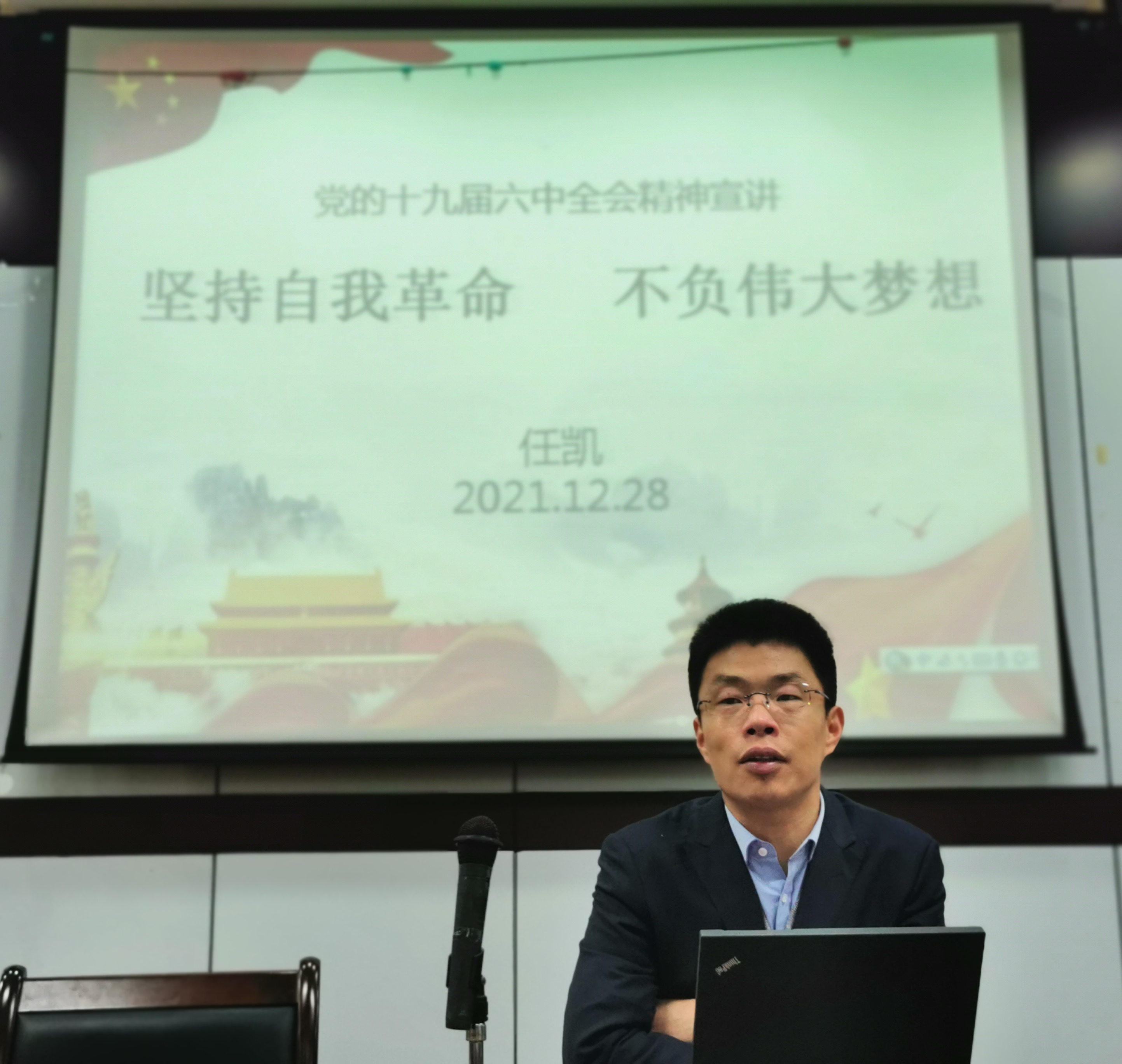 党的十九届六中全会审议通过了《关于党的百年奋斗重大成就和历史经验的决议》,全面回顾我们党百年奋斗的光辉历程,庄严宣示我们党以史为鉴、开创未来的坚定信心和必胜决心,向世人充分展示了百年大党正青春的蓬勃朝气、千秋伟业再出发的奋进姿态。任凯老师以“坚持自我革命,不负伟大梦想”为主题,围绕党的十九届六中全会精神,以八七会议、遵义会议以及延安整风运动这三次党自我革命为例,要求各位学生党员不断内省,发挥先锋模范带头作用。宣讲中,任凯老师强调了党对青年的重视,并对十九届六中全会提出的“要源源不断把各方面先进分子特别是优秀青年吸收到党内来,教育引导青年党员永远以党的旗帜为旗帜、以党的方向为方向、以党的意志为意志,赓续党的红色血脉,弘扬党的优良传统,在斗争中经风雨、见世面、壮筋骨、长才干”进行了重点阐述。