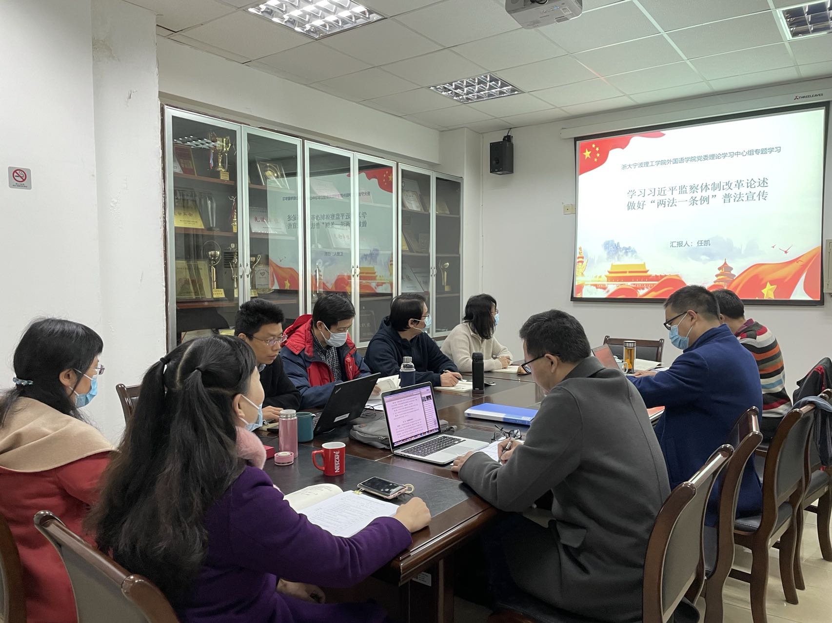 为深入学习习近平法治思想,贯彻落实习近平总书记关于全面从严治党和监察体制改革重要论述精神,12月16日外国语学院党委理论学习中心组开展“两法一条例”专题学习,学院党委副书记、纪委书记任凯作“学习习近平监察体制改革论述,做好‘两法一条例’普法宣传”交流发言。