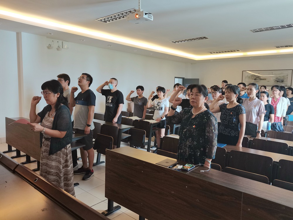 在建党100周年即将到来之际,为深入开展党史学习教育,外国语学院党委于6月11日在SC405组织全体教师党员举行重温入党誓词活动。
