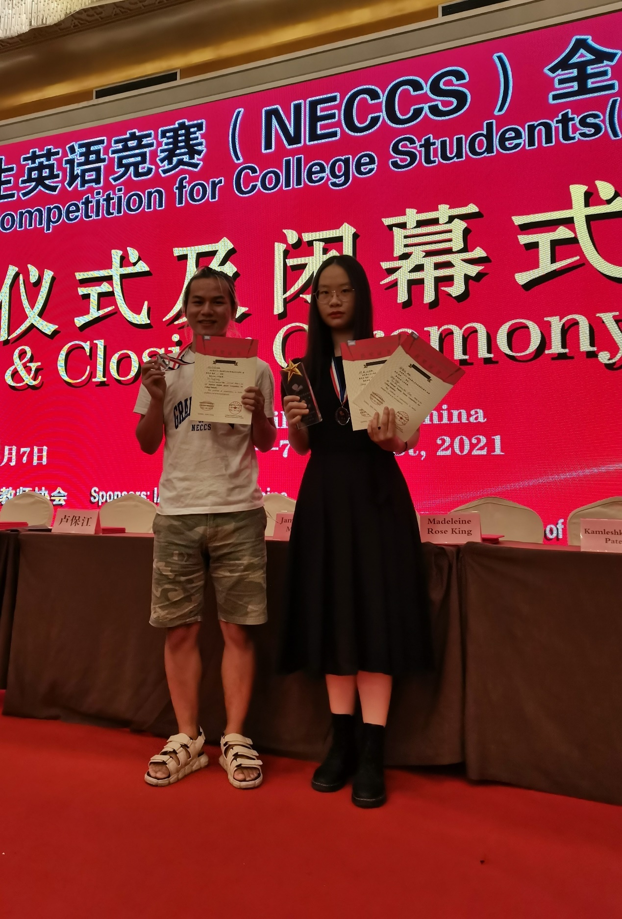 2021年全国⼤学⽣英语竞赛(NECCS)总决赛于8⽉2⽇-8月6日在广西桂林举⾏。我校外国语学院商英182班钟颖仪同学、传法学院网络与新媒体181班姚冯胜同学在总决赛中脱颖而出,成果斐然。经过多轮选拔,钟颖仪同学荣获辩论赛一等奖、演讲赛三等奖,姚冯胜同学荣获演讲赛二等奖。
