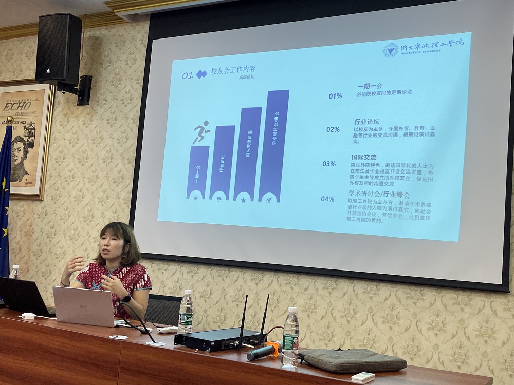 会上,王银萍代表校友分会做了半年度工作总结。2021年,外国语学院校友分会扎实推进各项工作,先后组建2001-2017级校友联系微信群,通过搭建联系沟通平台,定期分享学校相关动态和校友关心的事项,做好校友沟通交流;开展优秀校友寻访,定期在学院微信公众号进行推送;举办线上线下校友故事分享会5期,与校友和在校生分享行业动态、职场心得、职业规划建议等;对接校企合作,先后赞助开展日语朗诵大赛、日语专业文化体验活动等项目。