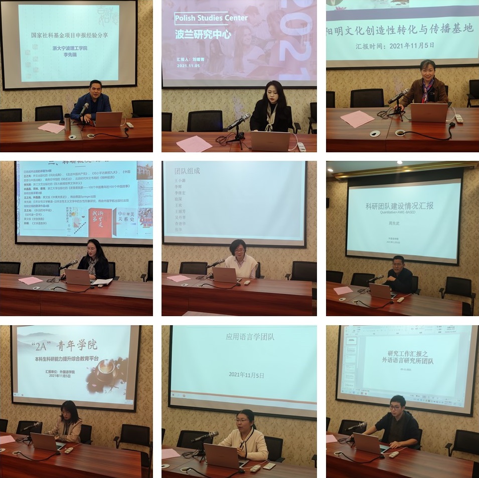 外国语学院从2020年开始试行科研团队制,依托外国语言和应用语言学两个研究所,凝炼“国别与区域”、“翻译与文学”、“文化与传播”、“语言与认知”等四个研究方向,结合学校“智慧化港口与服务”和“数字化设计与制造”两个学科群,建设“波兰研究中心”、“阳明学堂”、“日本文化”、“翻译与文学”、“语言认知”等9支科研团队。目前各团队已基本明确各自的发展方向及目标,并积极开展相关的研究工作。