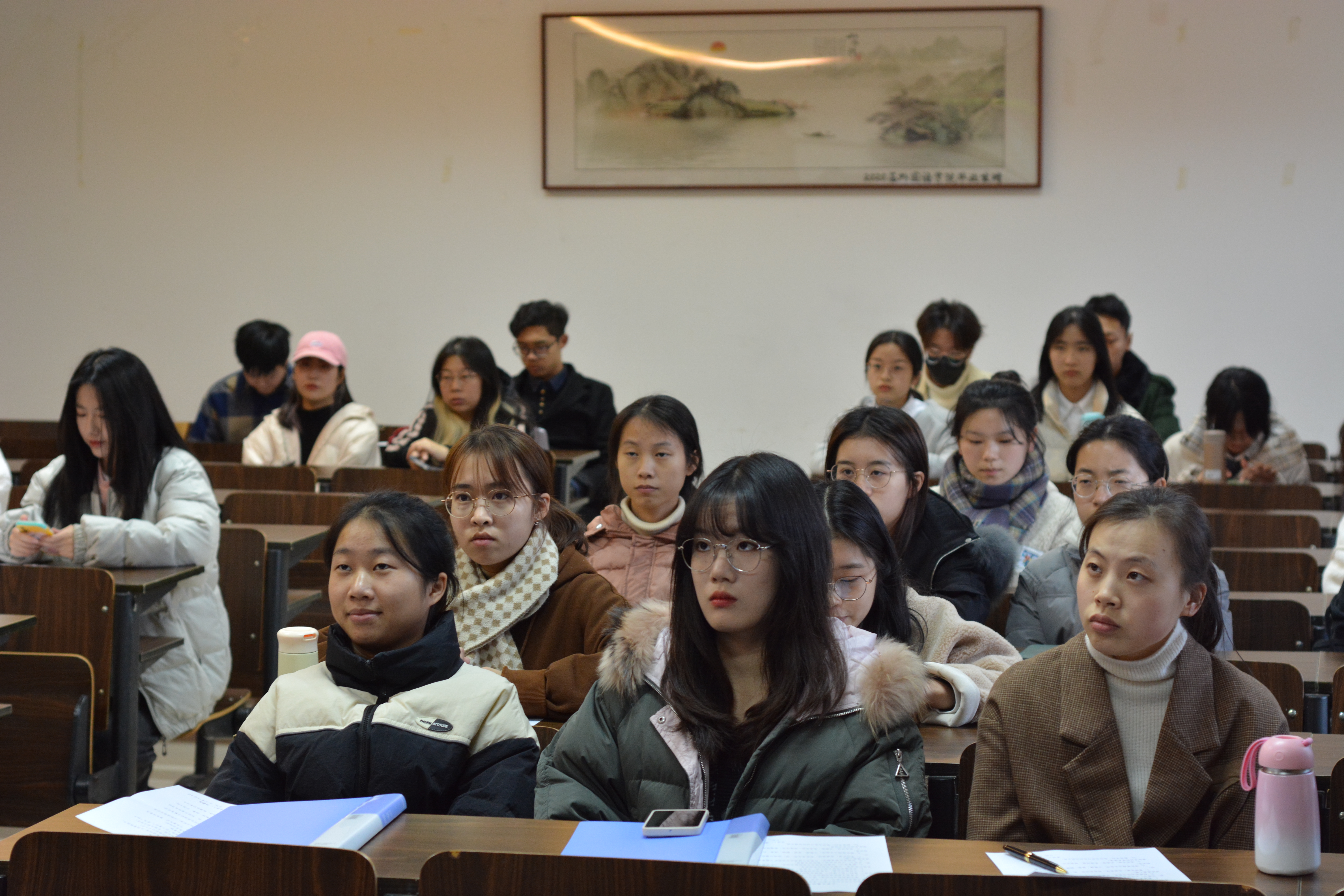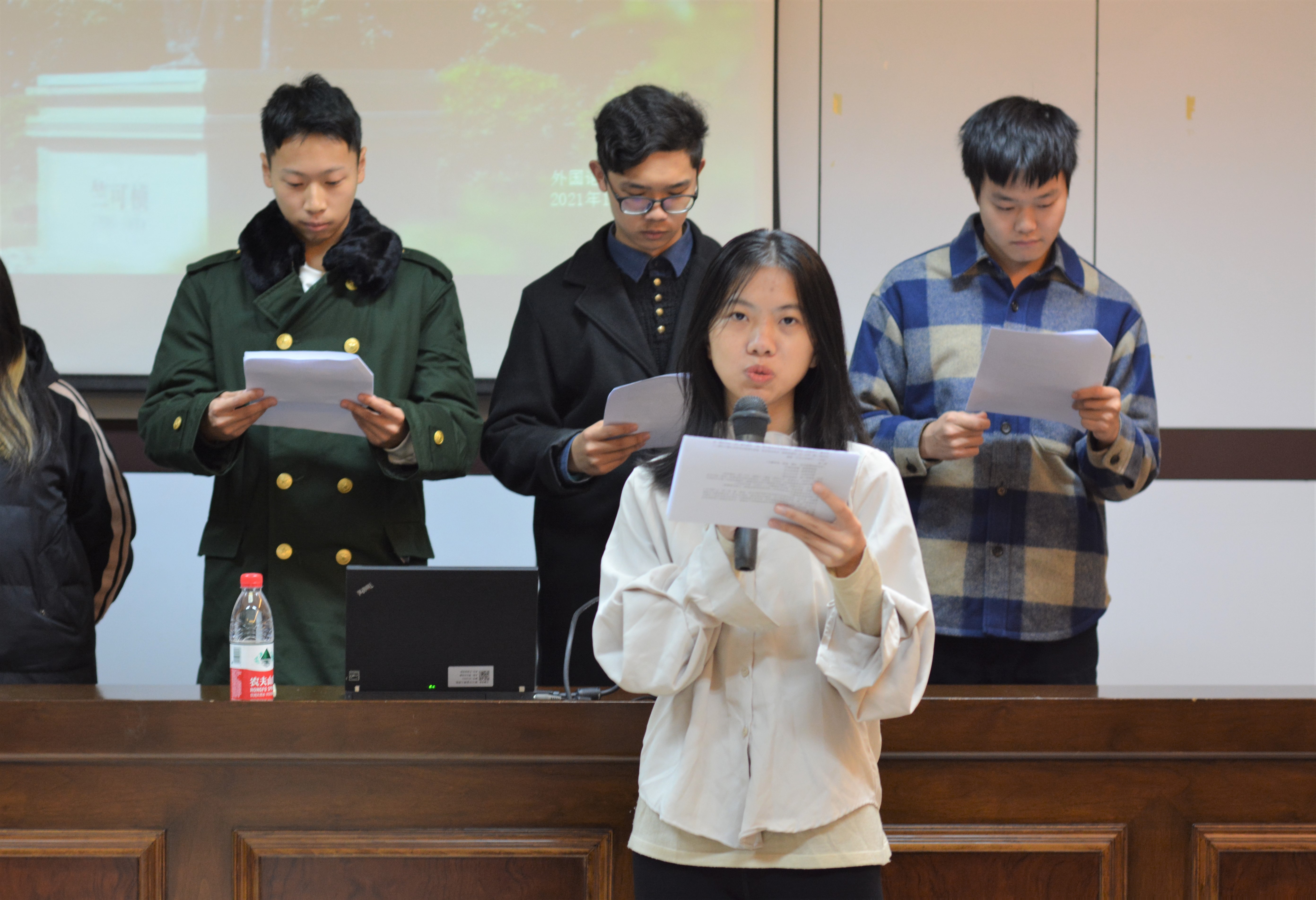 随后入党积极分子英语201班史欣艳、英语202班孙艳花、日语201班张正倩以及日语202班王杨慧带来了朗诵《先生之风,山高水长》。通过朗诵,一位学识渊博、坚忍不拔的先生形象跃然于观众眼前,使得在场同学感受到了竺可桢老校长的伟大精神,也将“勿忘求是精神,将求是精神在每一位宁理人身上传承”的理念传递给了大家。