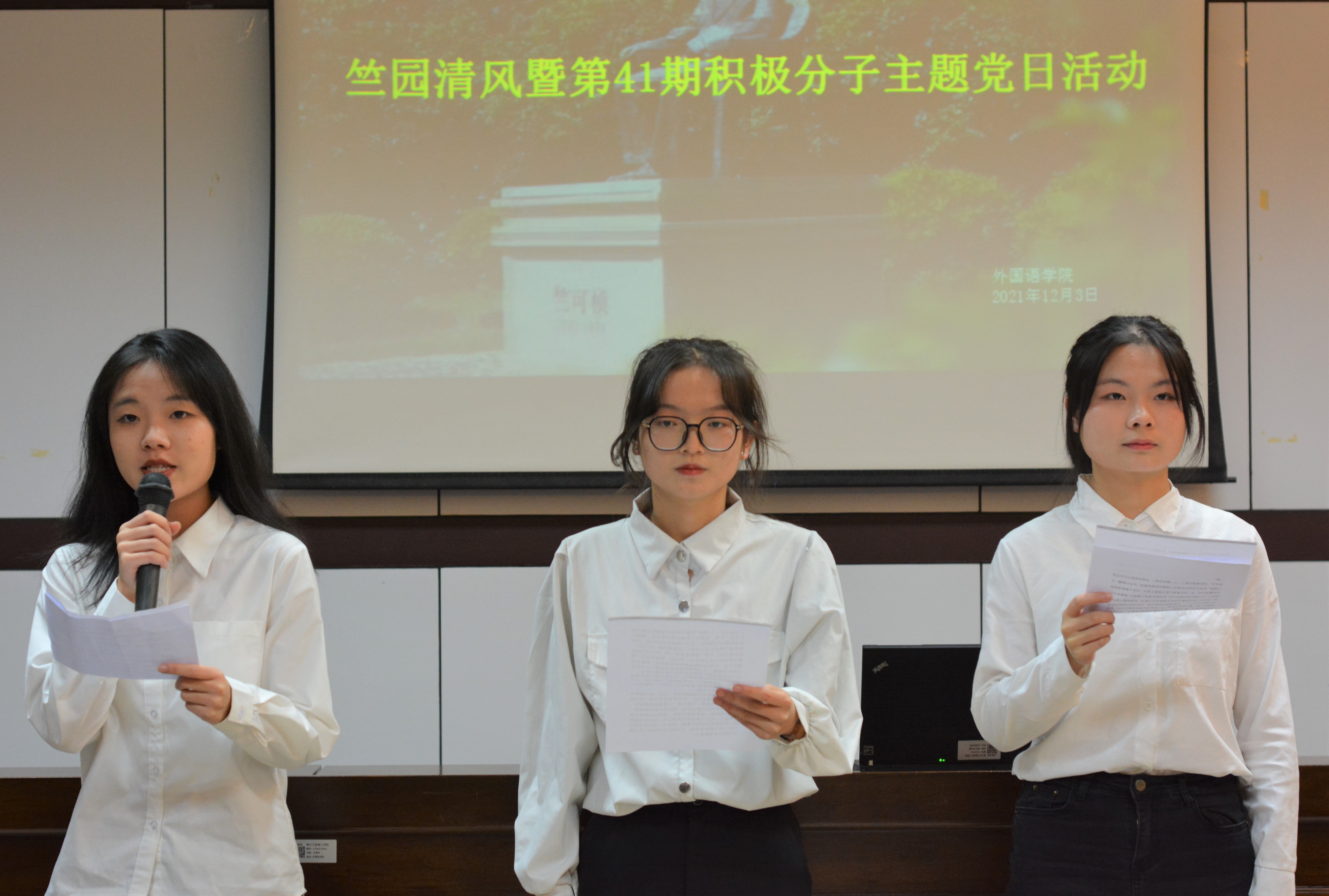 12月3日下午,正值学校第十届廉洁文化节之际,外语学院在 SC405举行了“竺园清风”经典朗诵会。外国语学院党委副书记、纪委书记任凯老师,学院思政主管芦美丽、第41期入党积极分子、艺术团代表、学生代表等近50人参加活动。活动由英语204 班姚可欣主持。