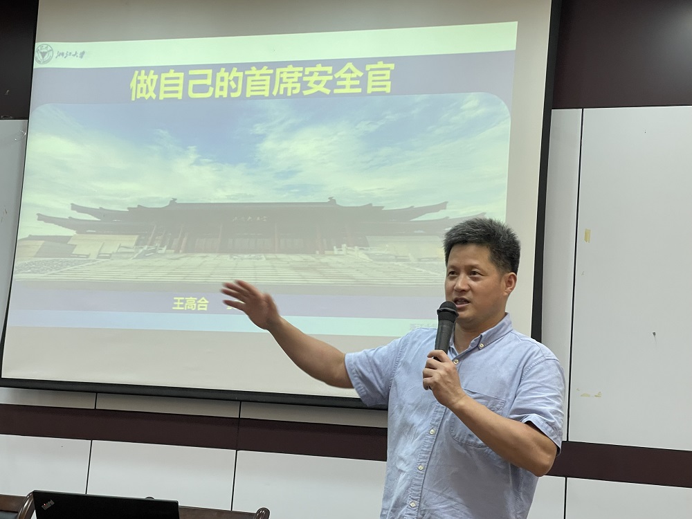 王高合处长从国家安全、交通安全、治安安全和消防安全四个方面向现场师生做了安全教育。针对当前大学生面对各类安全事故存在的安全意识薄弱的问题,他通过典型案例并结合自身多年的工作经验,向各位师生分析了常见的事故类型、发生原因和相对应的措施。此外,围绕高校电信诈骗这一多发的社会现象,王处长着重对师生们进行了反诈教育。