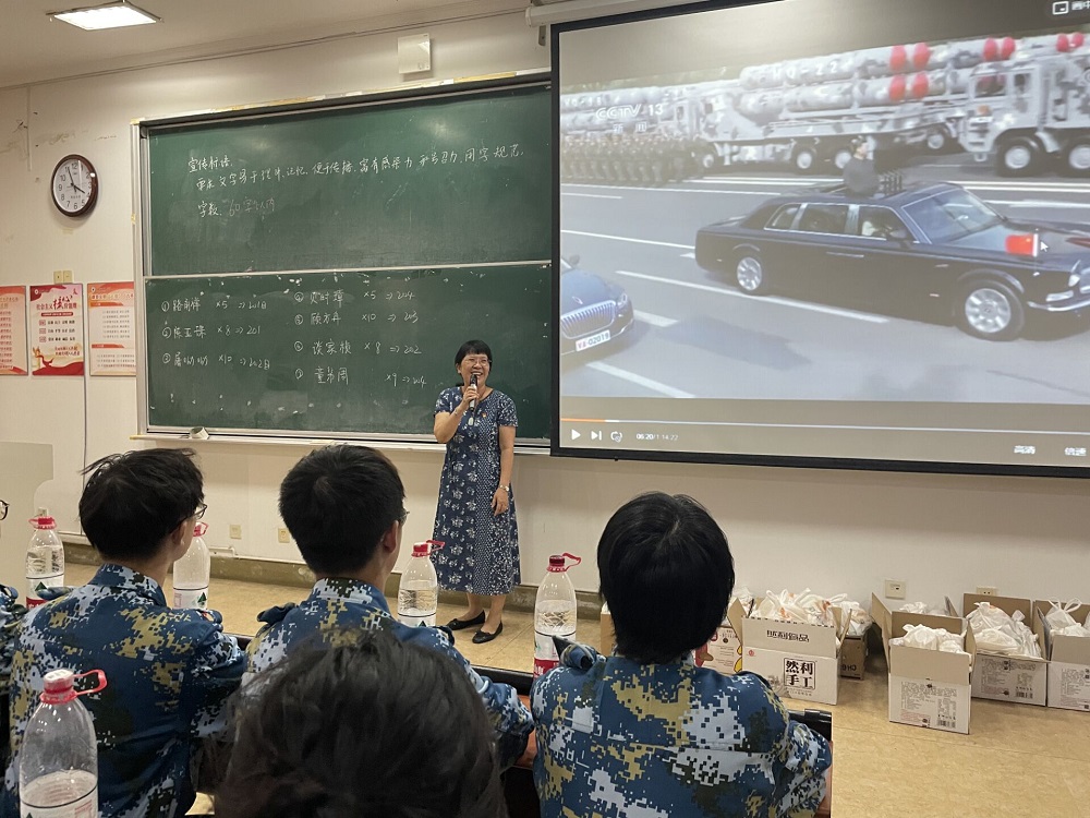 7月15日下午4点,外国语学院党委副书记(主持工作)傅晓宇代表学院,在SC204亲切慰问了七连参训学员。学院副院长周汶、党委副书记任凯、学院教师代表等也参加了此次慰问活动。