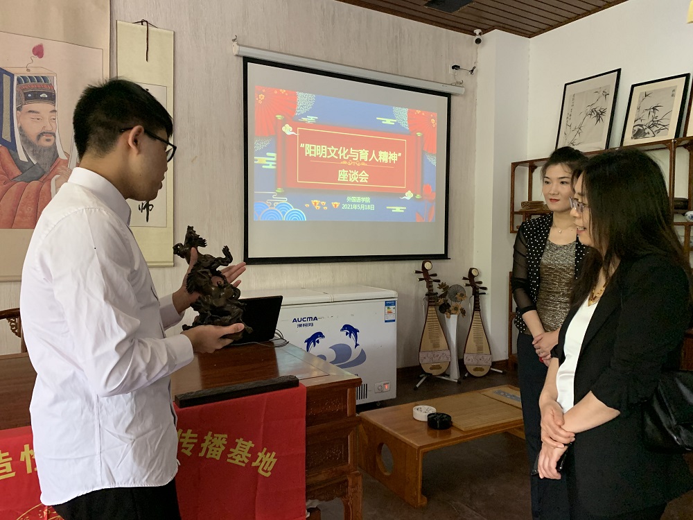 在座谈会开始前,由外国语学院阳明学社的讲解员高一鸣同学带领从春侠教授、焦岚老师和其他嘉宾老师一同参观阳明学堂并进行讲解。参观结束后,丁旭副教授代表阳明学堂对两位专家的到来表示欢迎,并对本次座谈会的流程和嘉宾做了简单的介绍。