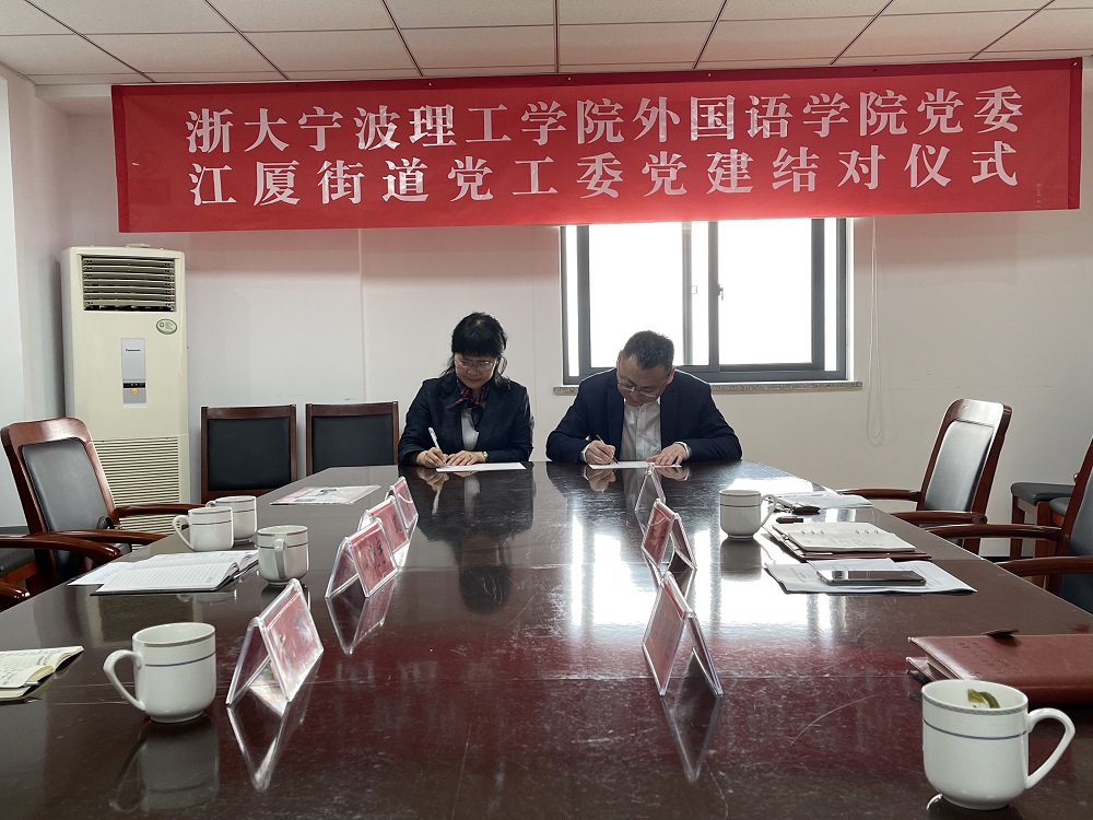 为庆祝建党100周年,进一步增强基层党组织的创造力、凝聚力和战斗力,4月23日早上,外国语学院党委副书记(主持工作)、副院长傅晓宇与江厦街道党工委书记陶宁在江厦街道党群服务中心签订了党建共建协议。