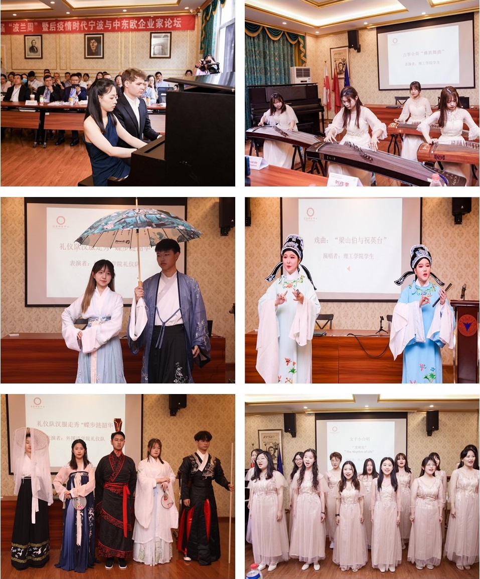 在开幕式上,中波文艺汇演精彩纷呈,浙大宁理的同学们精心准备的中英歌曲《茉莉花》、《Rhythm of Life》,还有《汉服走秀· 蝶步涟韶华》和古筝演奏《彝族舞曲》、越剧《梁祝》等一些富有中国传统文化元素的表演给现场的嘉宾留下了深刻的印象。其中由波兰研究中心的刘媛菁老师和波兰钢琴家Alexsky Kornicz携手合作的四手联弹创意串烧《梁祝》、《我和我的祖国》、《帕德赖夫斯基作品12之1》更是展现了中波艺术家的默契合作和精湛演出,将现场气氛推上了一个高潮,反响热烈。