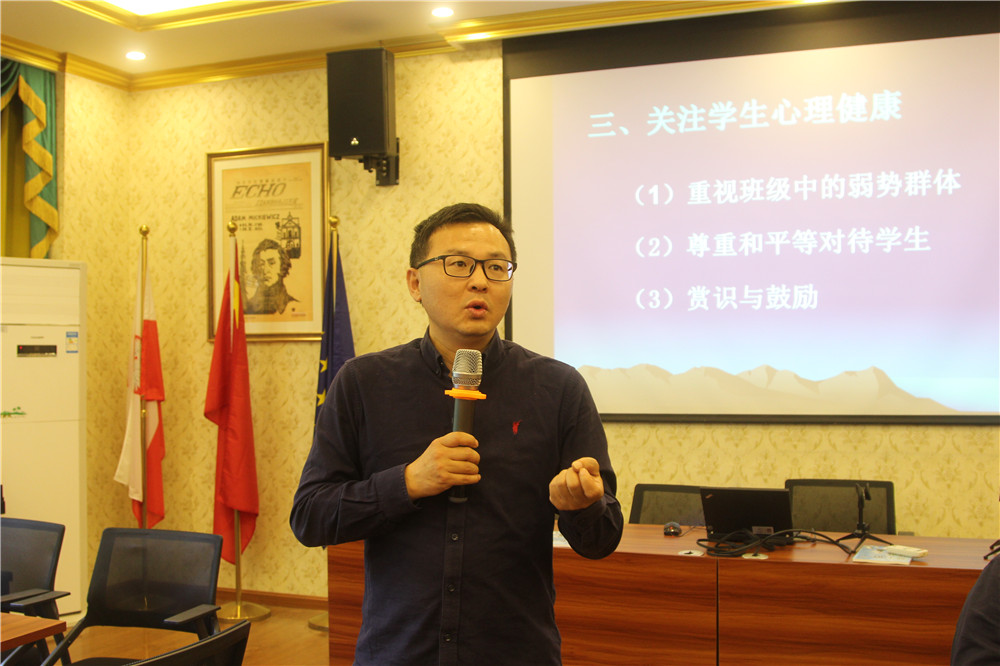 百年大计,教育为本,班导师是学生思想政治教育的重要抓手,为更好地促进班导师工作开展,帮助学生成长,5月7日下午,外国语学院“大先生”班导师读书、工作分享沙龙在波兰研究中心举行。本次活动邀请资深心理咨询师滕崇,学校学工部副部长、校团委书记周春晓,外国语学院副院长蔡亮教授,设计学院院长助理张峰,商英172班班导师徐志敏等5位老师作为分享嘉宾。外国语学院党委副书记(主持工作)傅晓宇、学院党委副书记任凯、全体辅导员和班导师参加了活动。