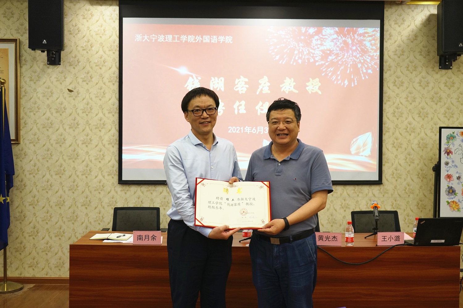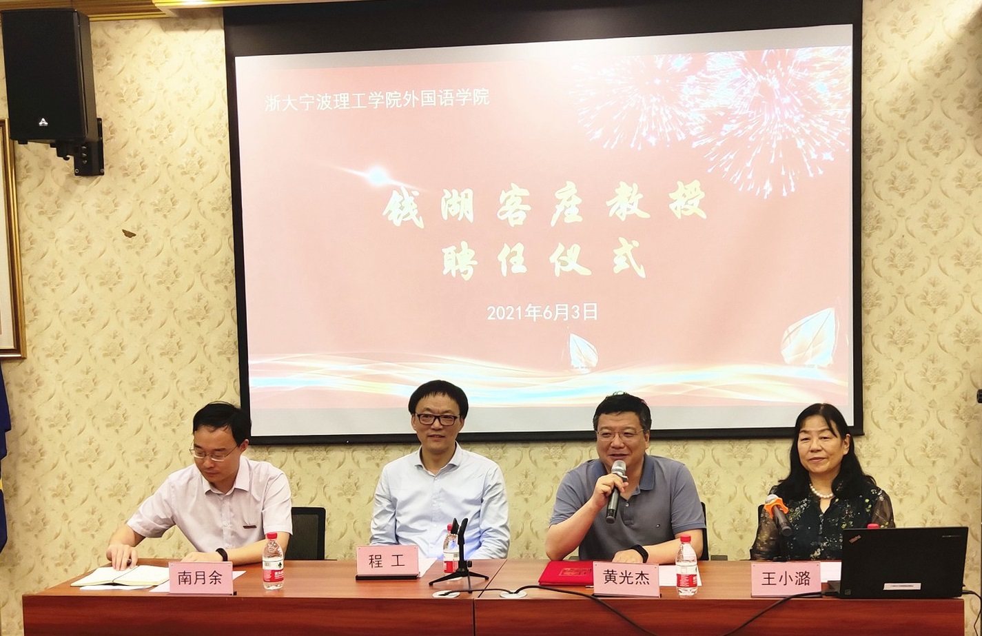 在仪式上,南月余宣读了聘任程工为我校“钱湖客座教授”的决定,黄光杰为程工颁发了聘书和校徽。程教授在仪式上发言,他表示多年来始终关心浙大宁波理工学院外国语学院的建设与发展,作为“钱湖客座教授”,自己一定会竭尽所能、为学院高速高质量的发展贡献一份力量。
