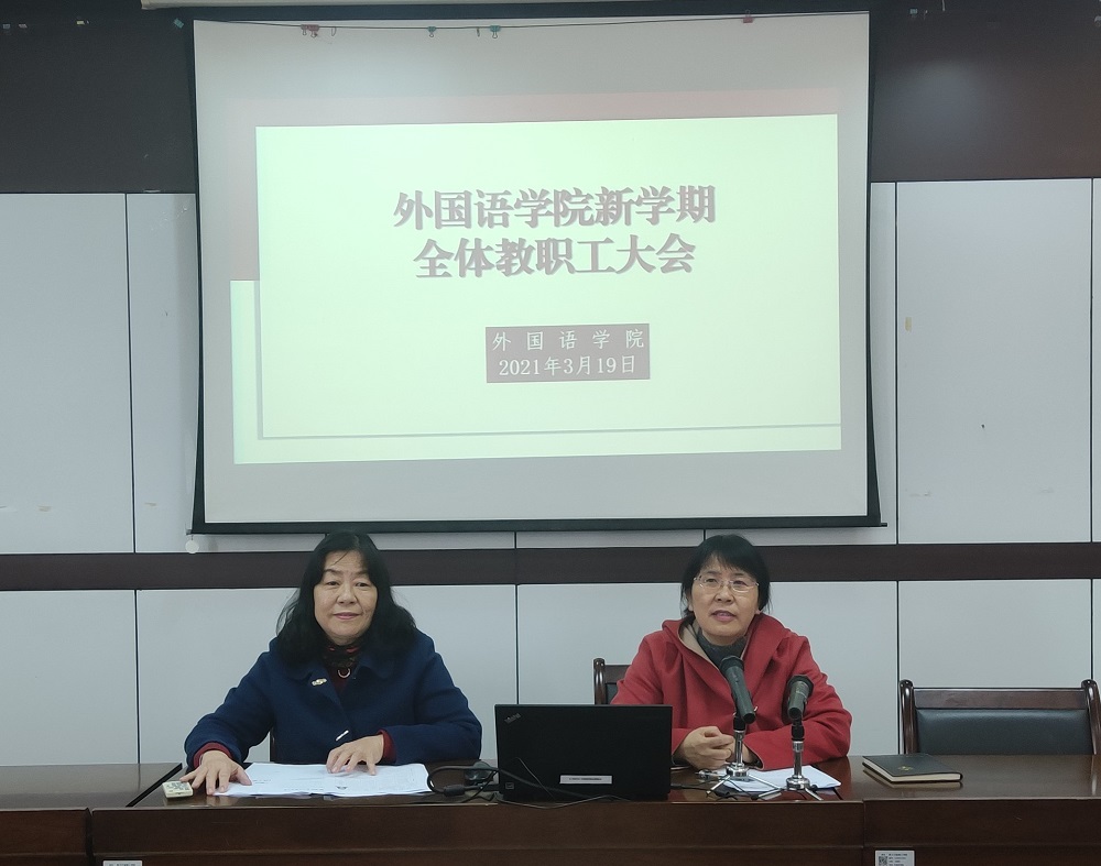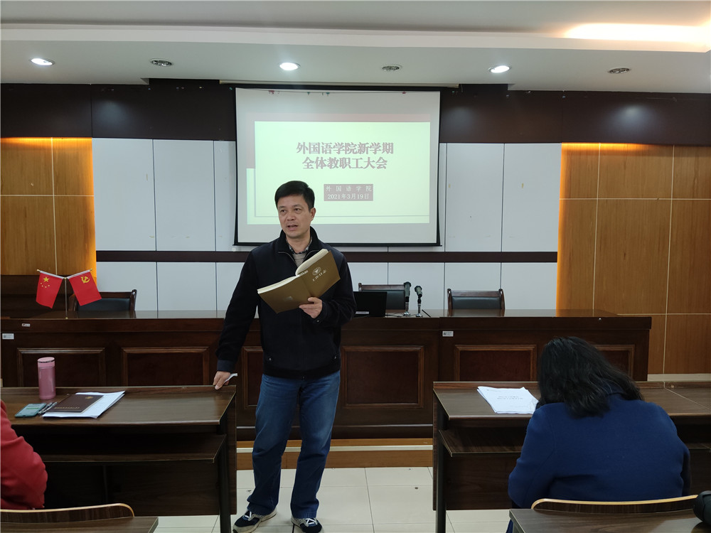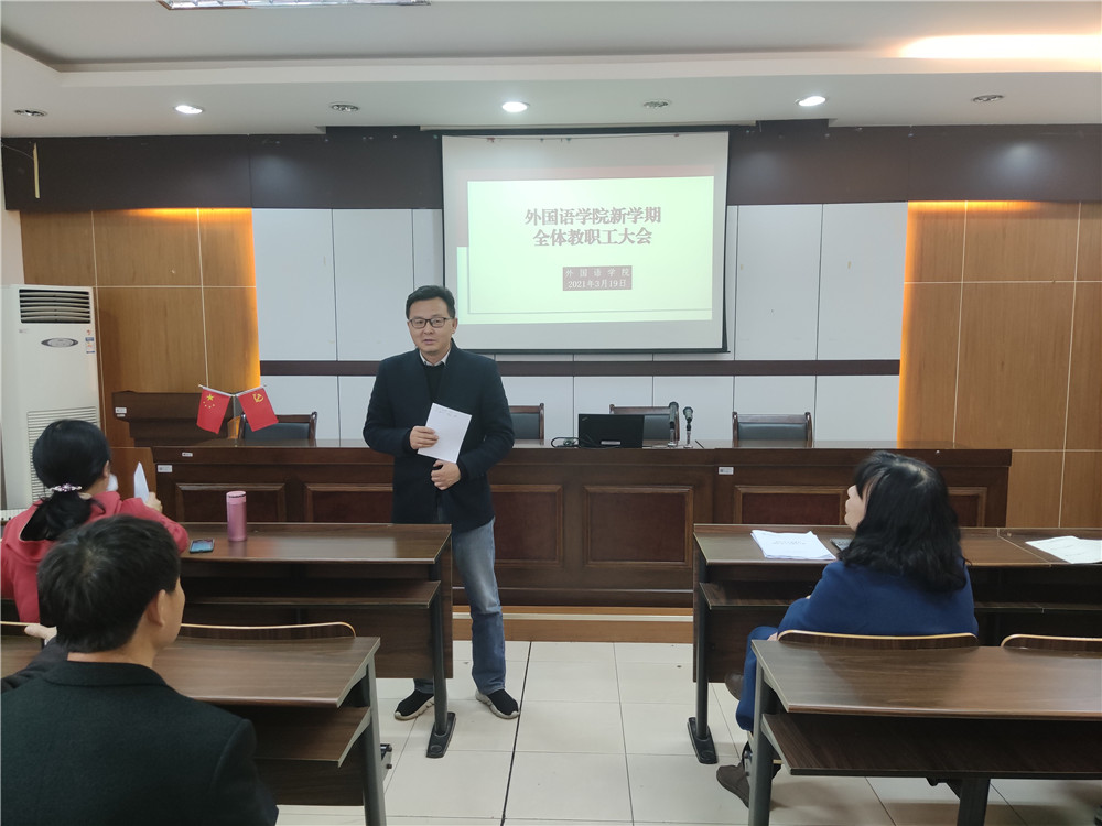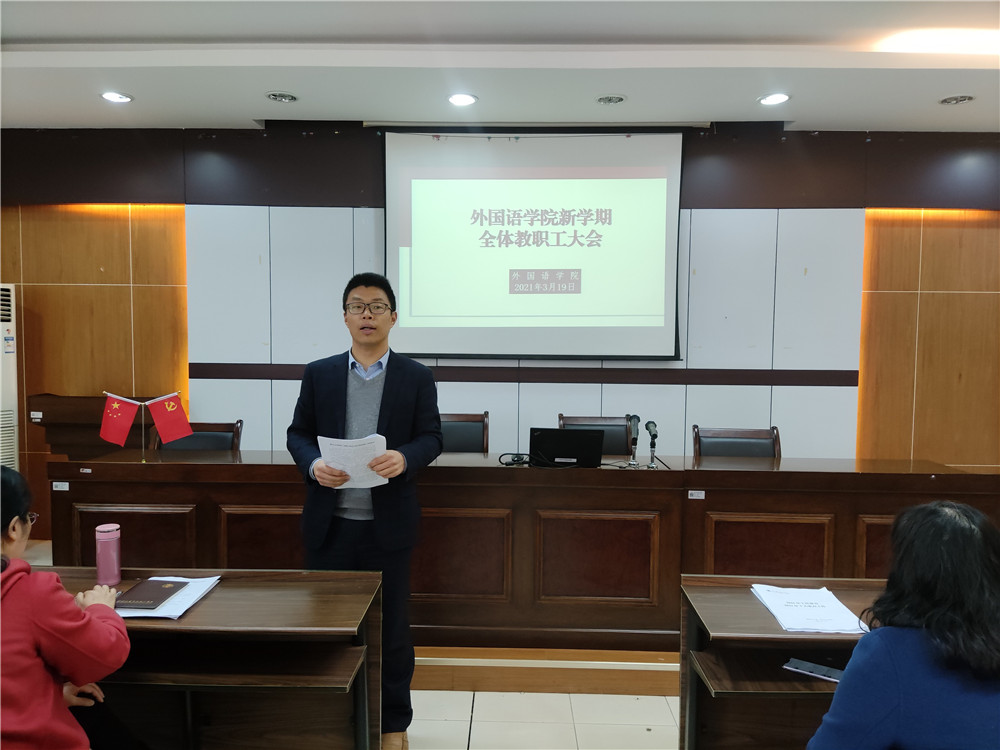 为了进一步统一思想,凝心聚力,顺利推进学院十四五开局之年的各项工作,3月19日下午,外国语学院在SC405会议室召开全体教职工大会,会议由党委副书记(主持工作)傅晓宇主持。