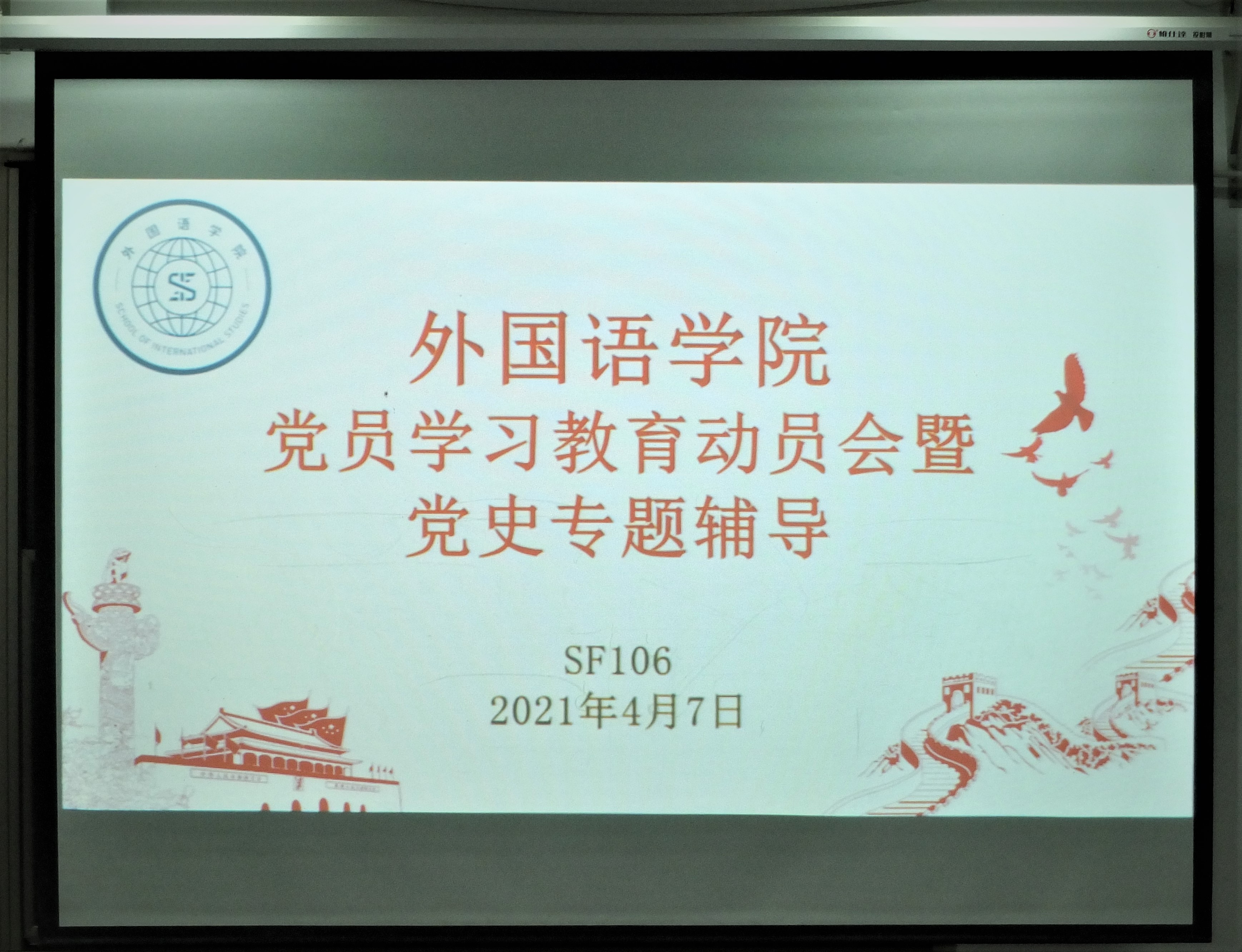 2021年4月7日下午3点,外国语学院在SF106举办党员学习教育动员暨党史专题辅导会议。学院党委副书记(主持工作)傅晓宇、学院全体教师党员、学生党员和入党积极分子参加了此次会议。会议由学院党委副书记任凯主持。