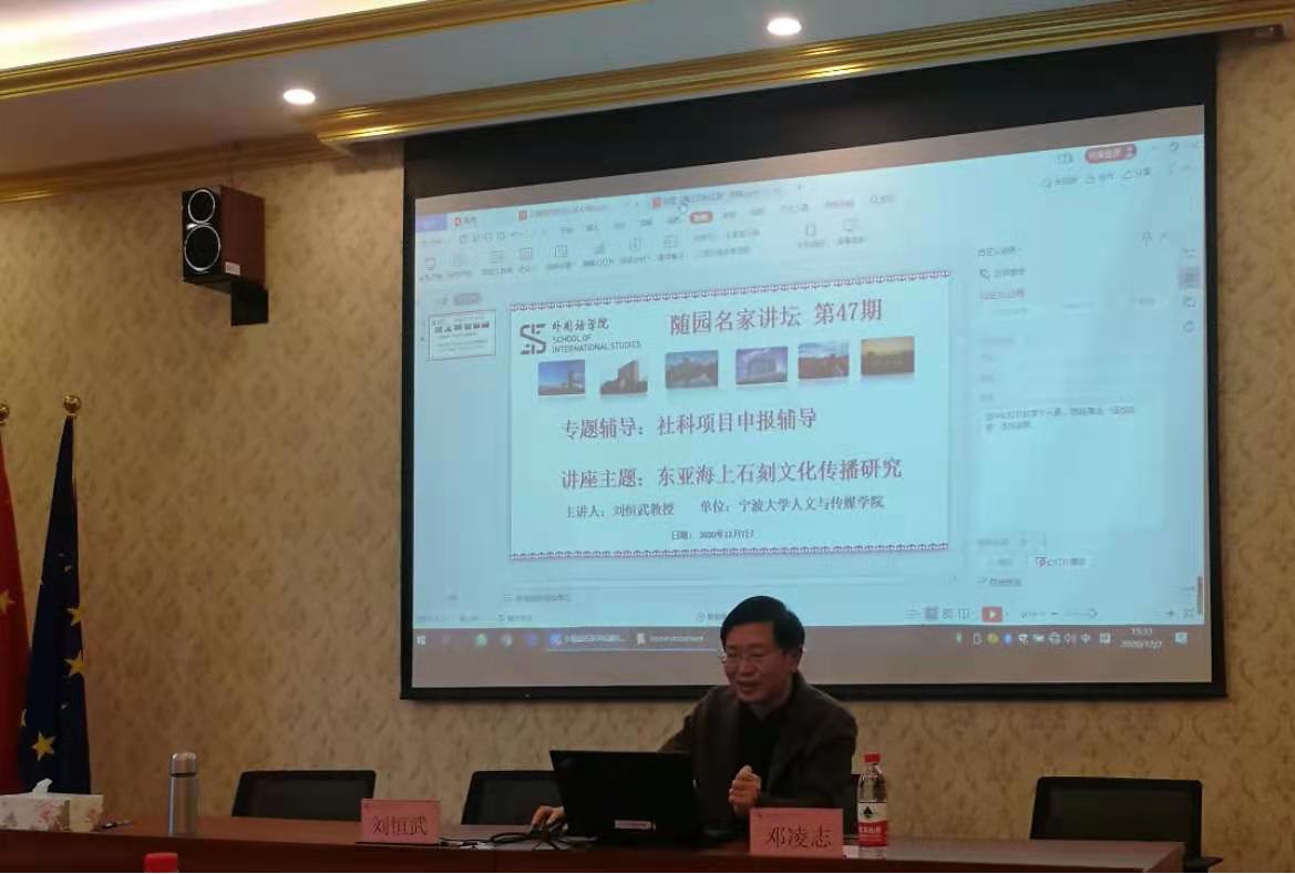 2020年12月7日下午,宁波大学人文与传媒学院刘恒武教授在我院SC106波兰学术中心作“[随园名家讲坛46期]东亚海上石刻文化传播研究”讲座。讲座由日语专业教研室主任邓凌志老师主持。