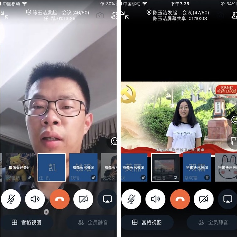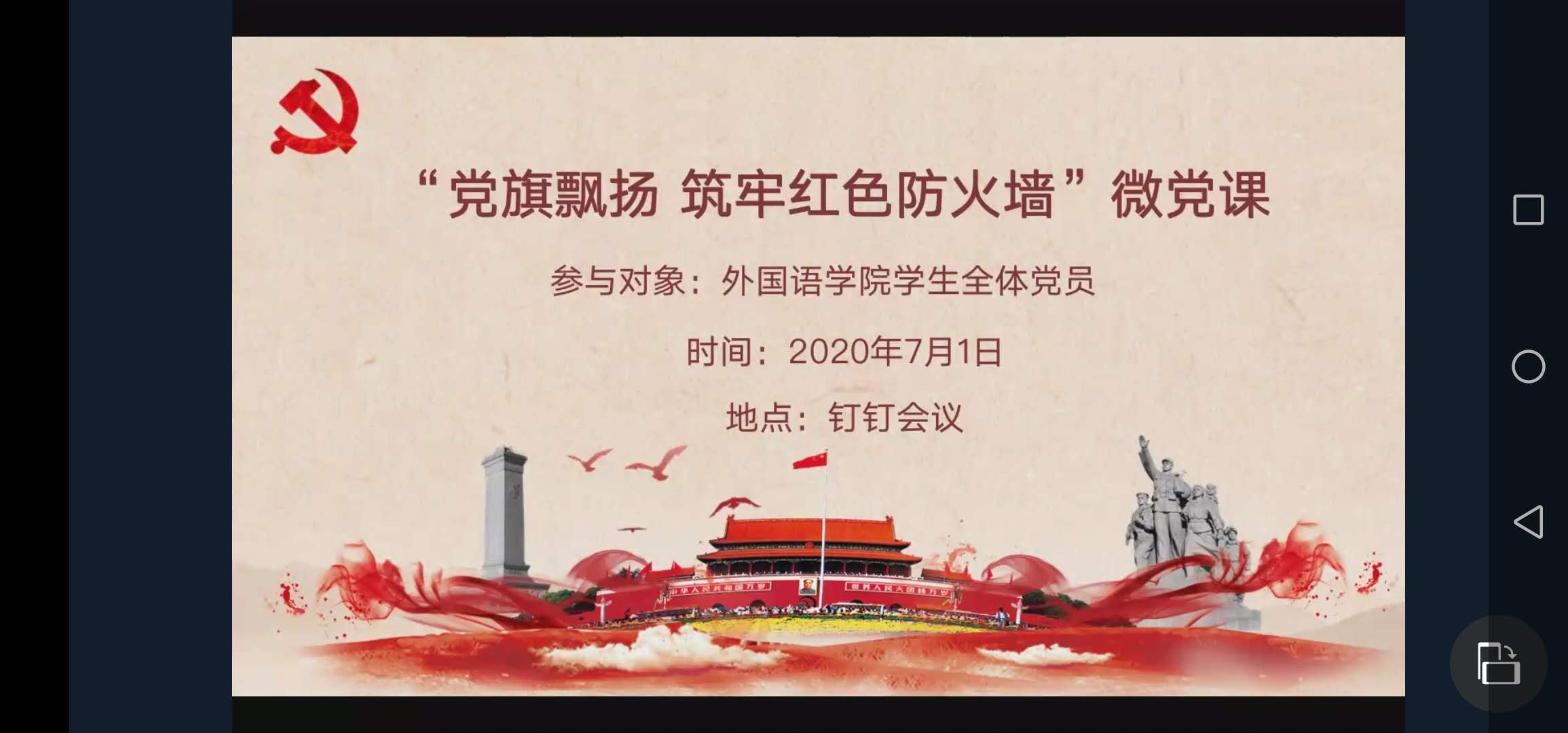 在中国共产党第99个生日之际,7月1日晚,外国语学院学生第一、第二党支部组织全体学生党员在钉钉群集中观看了《高校党组织战“疫”示范微党课“七一”专场》。学院党委副书记任凯、学生第一党支部书记芦美丽、学生第二党支部书记刘杜娟参加了活动。